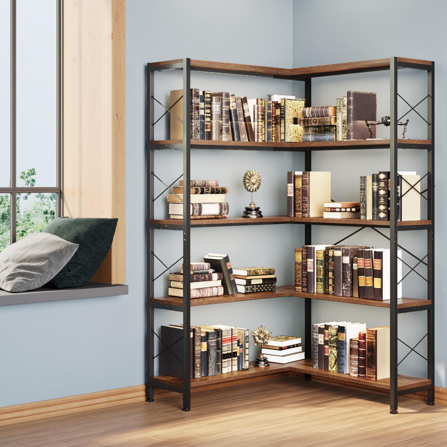 - ✅【SOPHISTICATED MEETS PRACTICAL】Together with the rustic brown wood and matte black steel frame, this sleekly-designed, warm-toned corner bookcase gives your home or office a touch of industrial charm while keeping your space free of clutter. Fill the book shelf with eye-catching knick-knacks, and it will definitely become a centerpiece of your home.