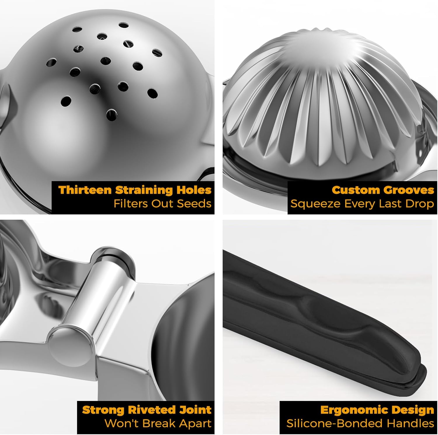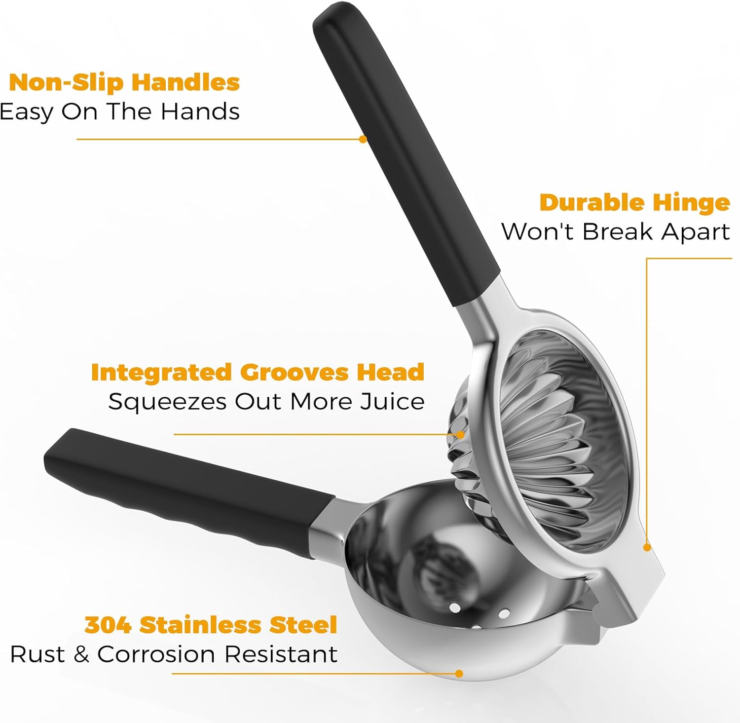 - Perfect Design - We devised the optimal bowl size, and added reinforced hinges, thick casting and strong levers. Your hands will never run out of juice when using our thickly formed, silicone-bonded handles.
