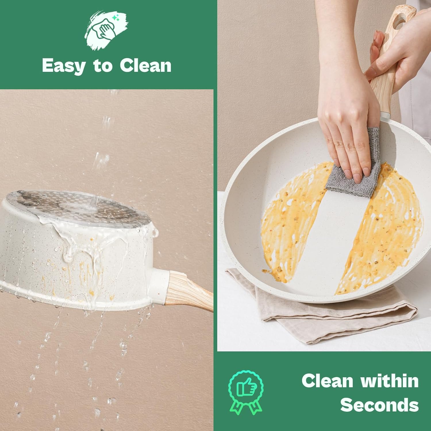 - Easy Cleaning – Spend Less Time Scrubbing, More Time Cooking. Simply wipe with a sponge or rinse under water to clean these pans sets—no soaking, no scrubbing, no stress.