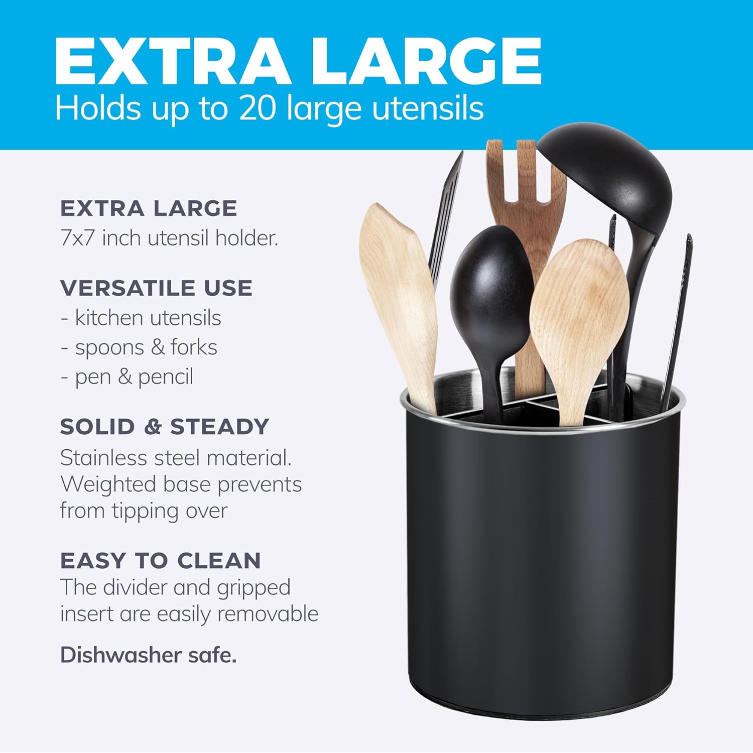Rotating Extra Large Stainless Steel Utensil Holder Caddy with Sturdy No-Tip Weighted Base, Removable Divider, and Gripped Insert Bottom -Dishwasher Safe Metal Cooking Utensil Holder (Black)