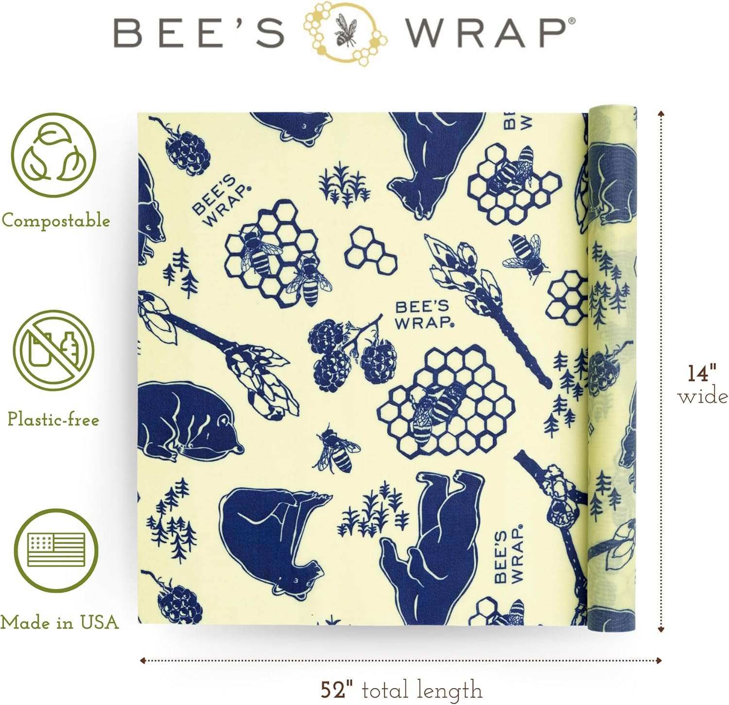 Bee's Wrap Beeswax Wraps for Food - Bees + Bears Cut to Size 14x52" Wax Paper Roll - Made in USA Reusable Waxed Paper & Bowl Covers - Organic & Eco-Friendly Alternative to Aluminum Foil & Plastic Wrap