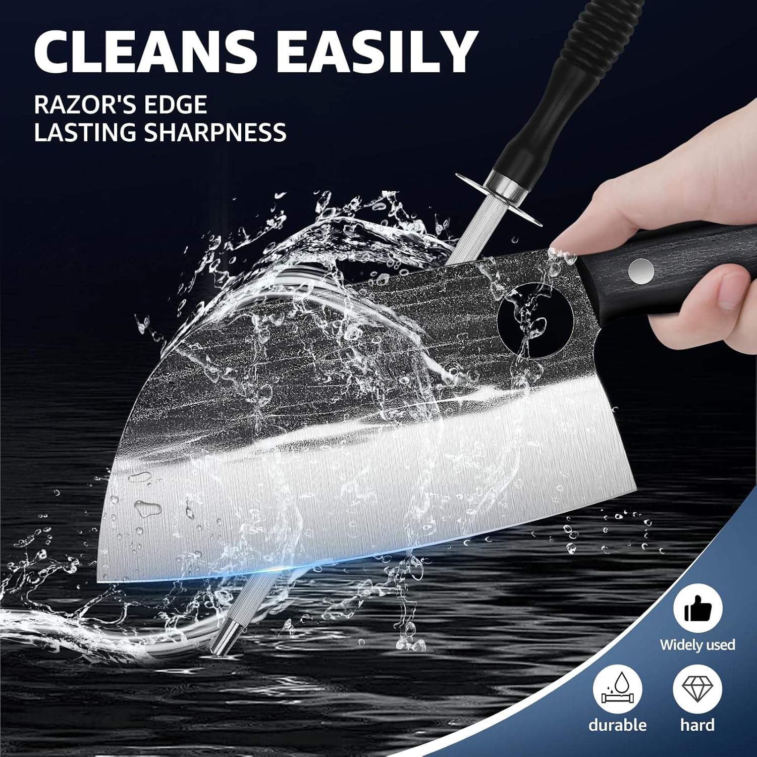 - Versatility Butcher Knife Set:The 7 knives in this set are meticulously crafted to meet the demands of professional chefs and home cooks alike. Included are a Serbian Chef Knife, a Nakiri Knife, a Kiritsuke Chef Knife, 2 Boning Knives, and 2 Cleavers. Each knife is expertly designed to excel in specific tasks, ensuring that you have the perfect tool for every culinary endeavor. It's a versatile addition to your collection and a perfect gift for any occasion.