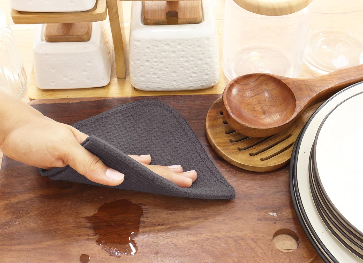 PurpleEssences Dish Cloths and Dish Rags - 8 Pack Waffle Weave Solid Kitchen Dish Wash Cloths, 100% Cotton, 12 x 12 Inches, Ultra Soft Absorbent Quick Drying - Spring Summer - Dark Grey