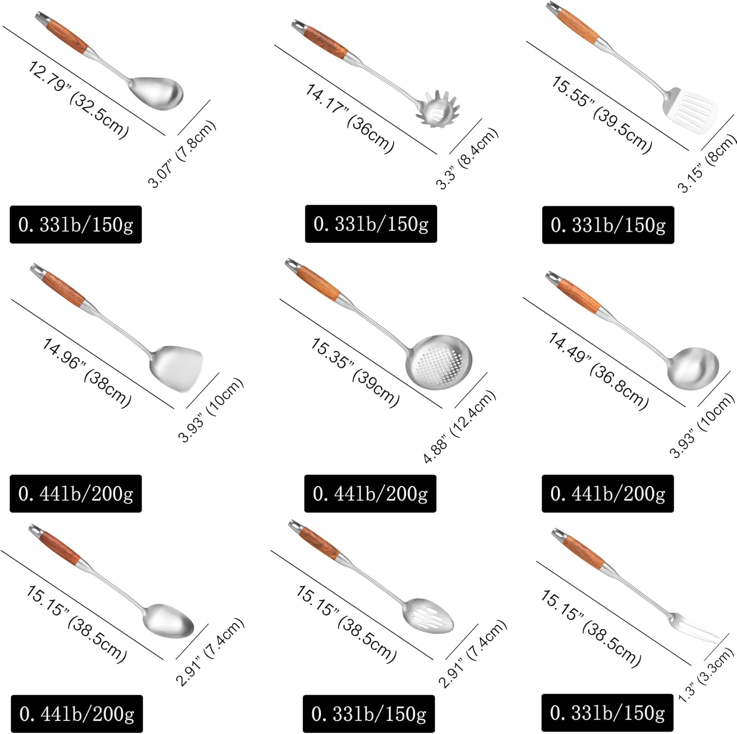 - Professional Kitchen Utensils Set: Clean lines, good weight and well balance. The wooden handles are not too heavy, help you eliminate stress on the arms and provide a comfortable ergonomic grip. Wooden handle reduce heat transfer, anti-scald, help you stay out of the soup or keep you away from the heat and flame.