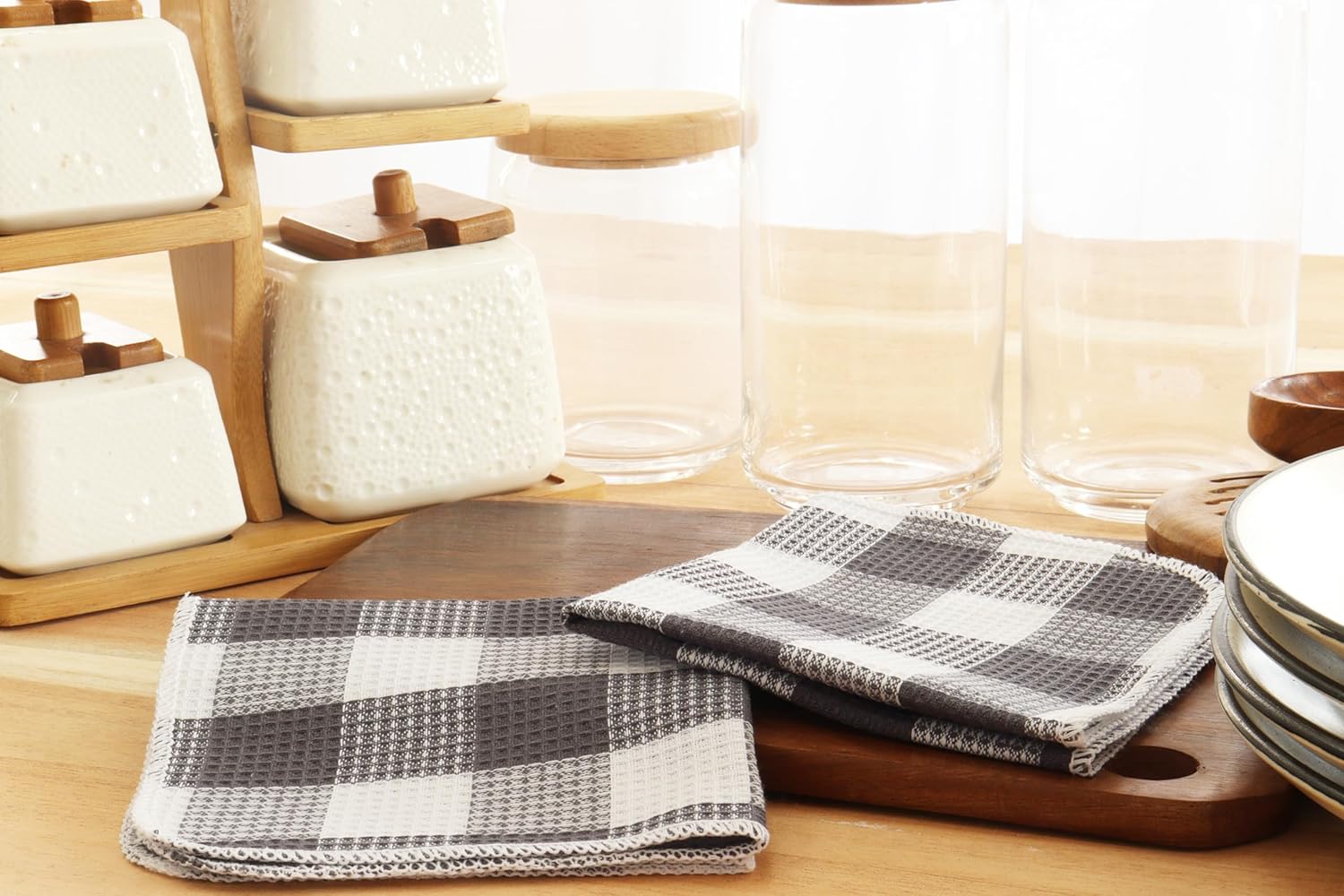 Waffle Weave Plaid Dish Cloths, 100% Cotton - 12 x 12 Inches, Ultra Soft Absorbent Quick Drying Dish Towels Buffalo Check Dish Rags for Kitchen, 8 Pack - Spring Summer - Steel Grey & White