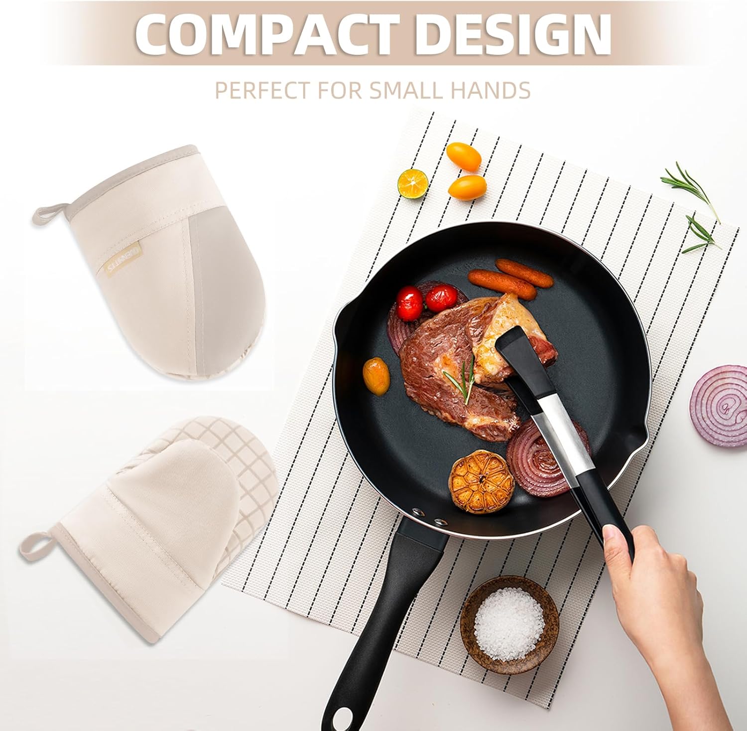 - 1 PAIR MINI SIZE OVEN MITTS: The size of the oven mitts is 7.7x5.3 in(L x W). A simple and practical design can fit the palm better. The mini design makes kitchen mittens take off and wear more conveniently.