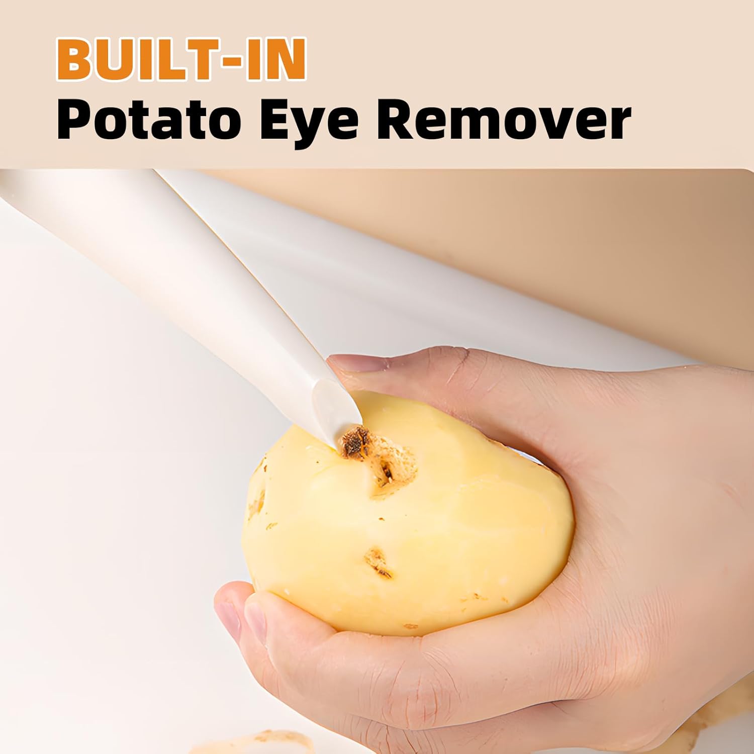 - đ„ăEffortless Peelingă: This peeler was tested for scraping fruits and vegetables of varying hardness and softness, and was able to peeling the skin effortlessly, even when dealing with harder vegetables such as pumpkin.With built-in potato eye remover, it is a high quality kitchen potato peeler.