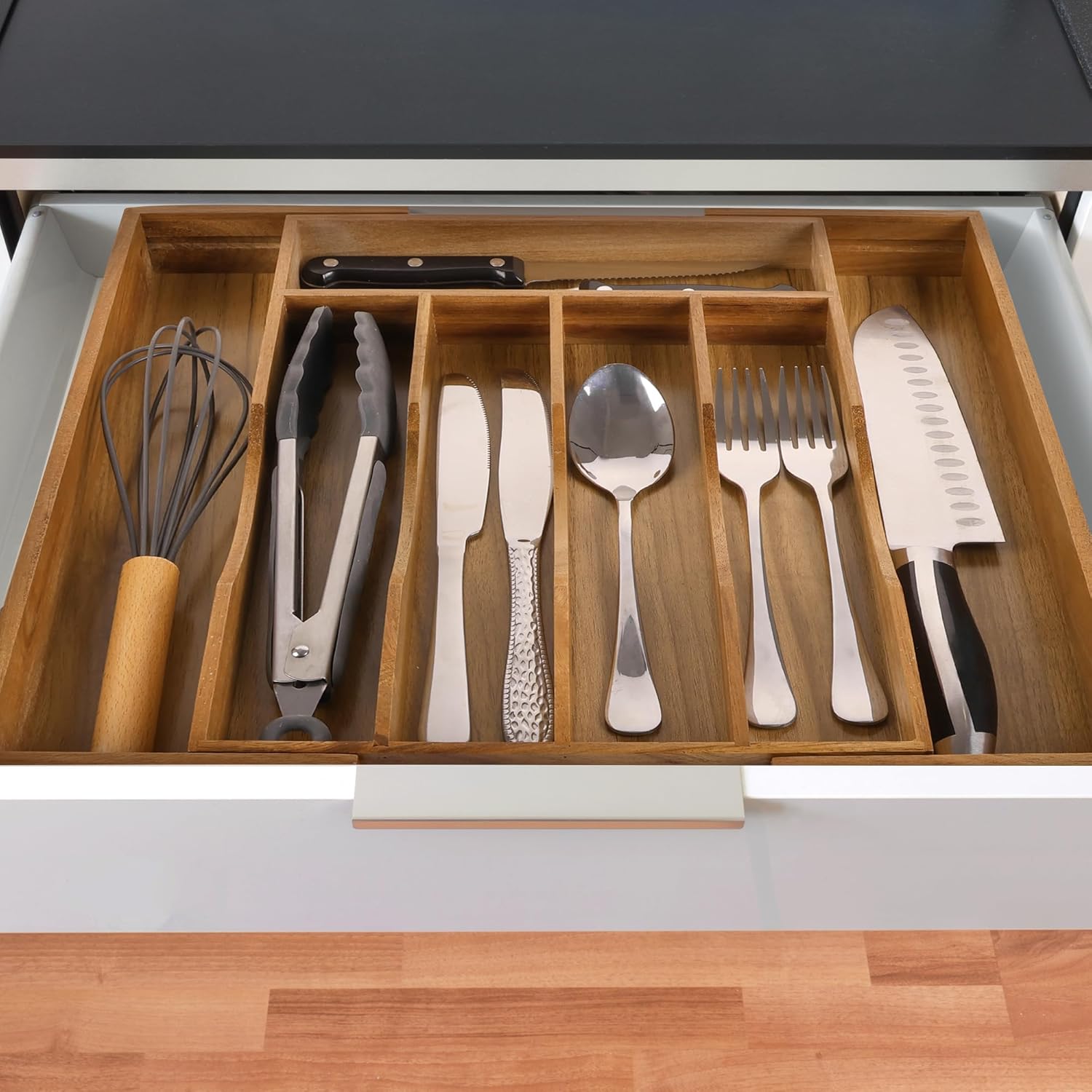 - [START YOUR KITCHEN ORGANIZATION]: The 10.04" - 15.5" wide, 13.98" long and 1.97" deep acacia drawer organizer can tame your out-of-control kitchen drawers, to store and organize the cutlery and kitchen utensils according to your rules, and maximize the drawer storage. Keep everything accessible and organized, so that you don't have to rifle around for your cooking tools. Beautiful and practical kitchen drawer organizer turns the cooking and tasting into things of beauty and efficiency.