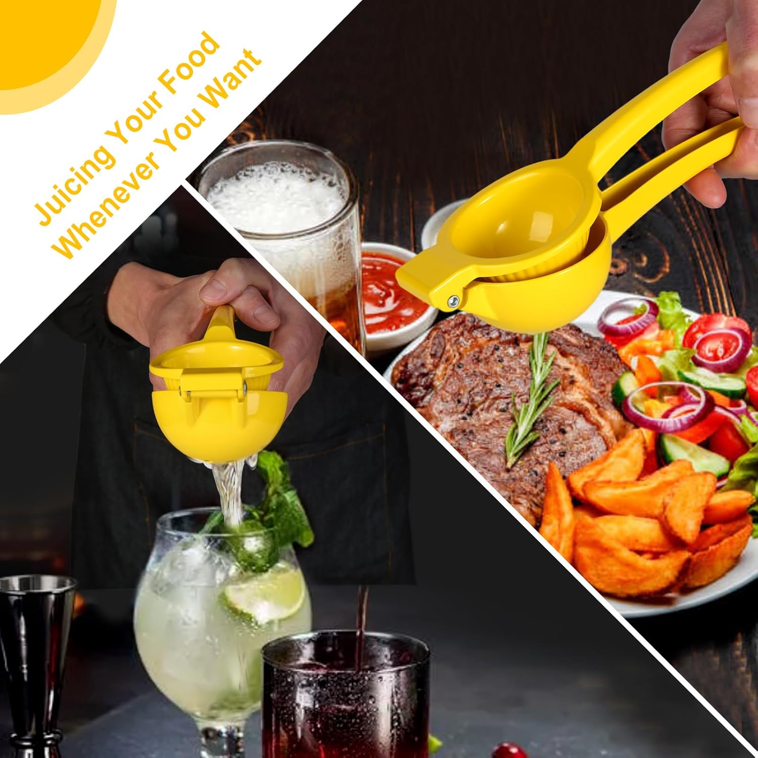 - [Widely Use] With a big size bowl to hold and squeeze kinds of fruits:lemon, orange, lime, citrus, easily juice the original flavor when & where ever you want, enjoy high-quality life. With this fuit juicer, you can juice the meat, mixed with vegetables, BBQ, or make a cocktail or bartending at home.