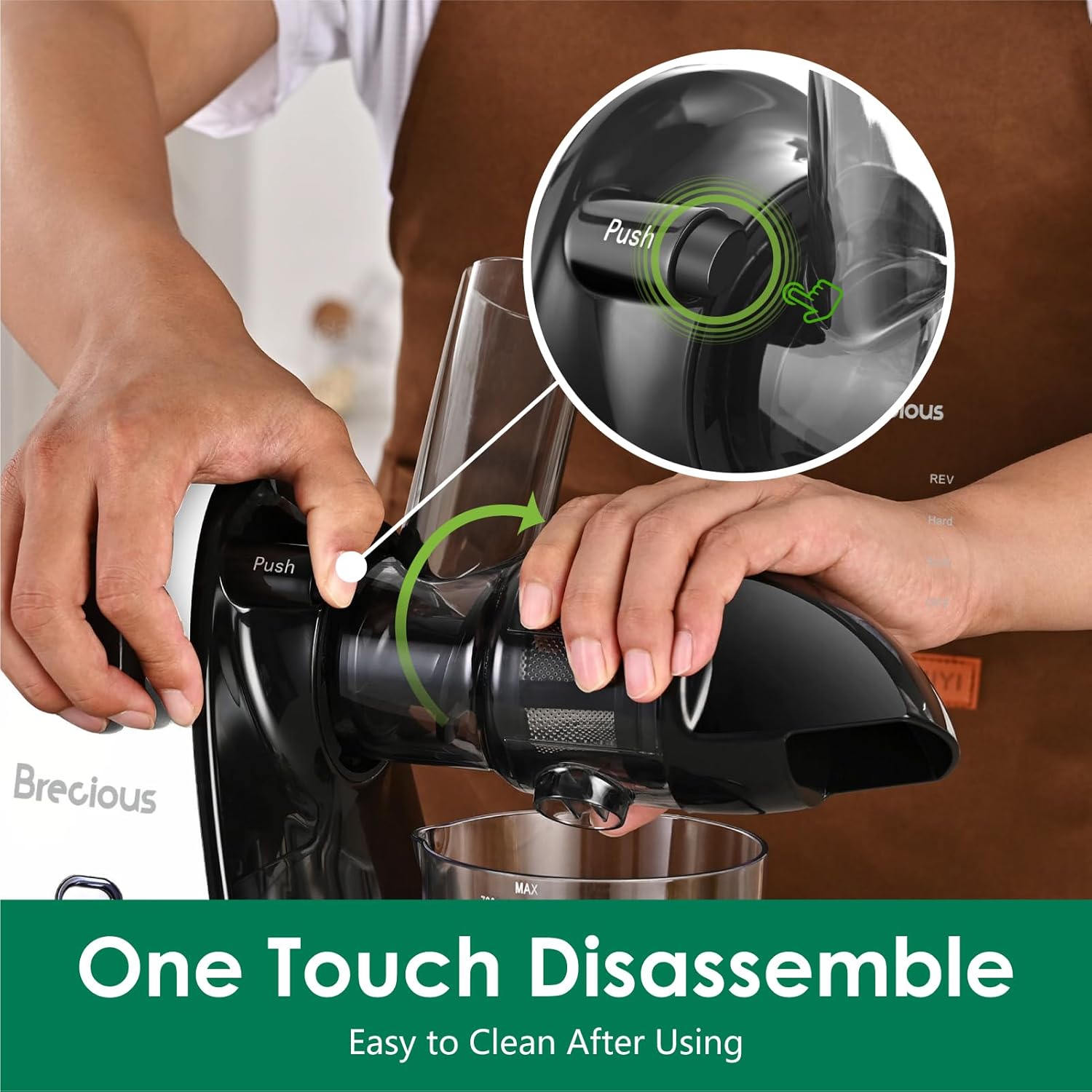 - Cold Press Slow Juicer: The Brecious Slow Masticating Juicers features slow cold press technology, a quieter powerful motor, and a 90% high juice yield to retain more nutrients and vitamins. The Brecious Masticating Juicer Machines uses upgraded 7 auger grinds for maximum juice yield, minimum oxidation and maximum nutrient