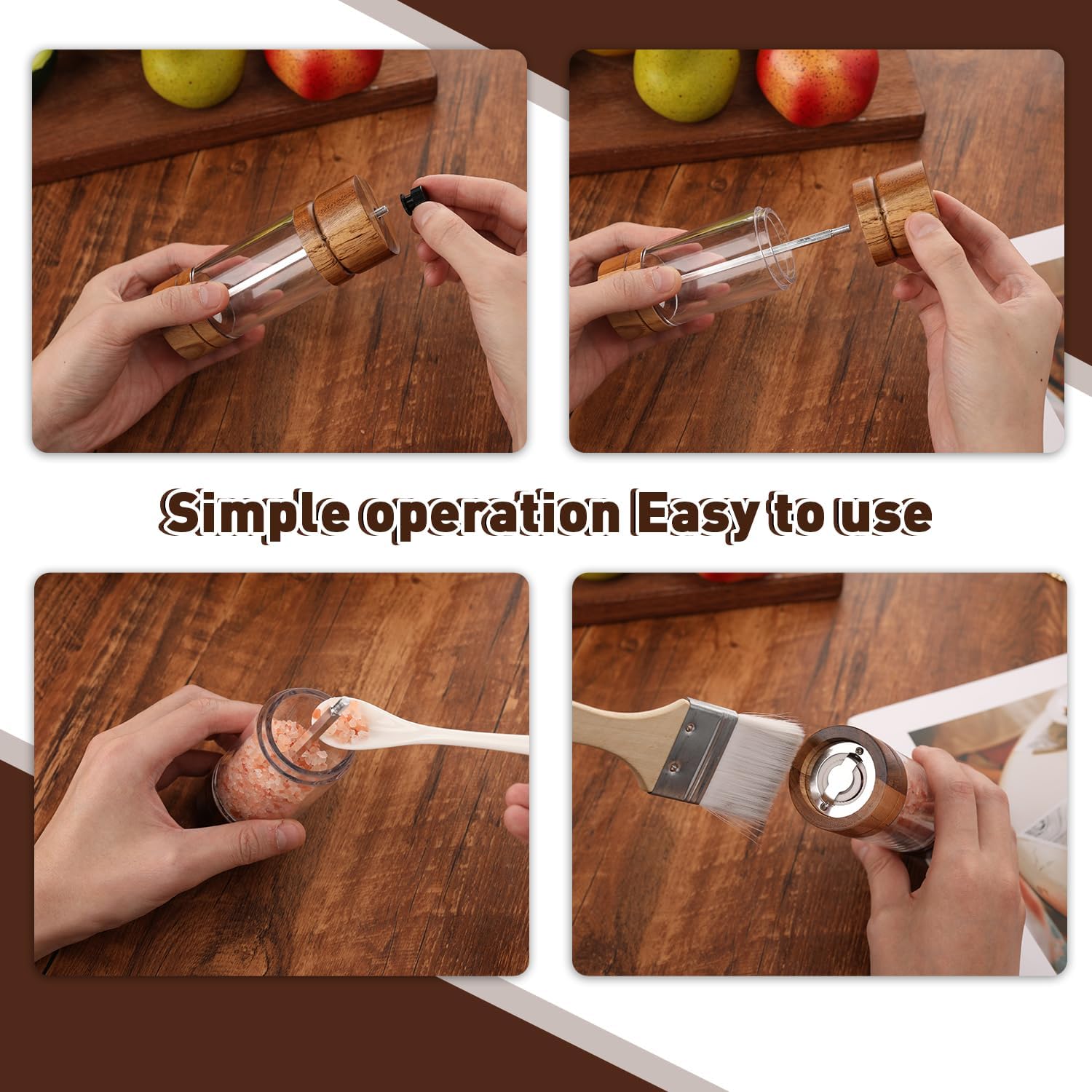 - EXCELLENT QUALITY - Compared to traditional plastic pepper grinders, our pepper grinder set is made of solid acacia wood and acrylic glass, ceramic core covered with stainless steel, non-corrosive, won't absorb flavors, clear window for easy spice identification Type and remaining capacity