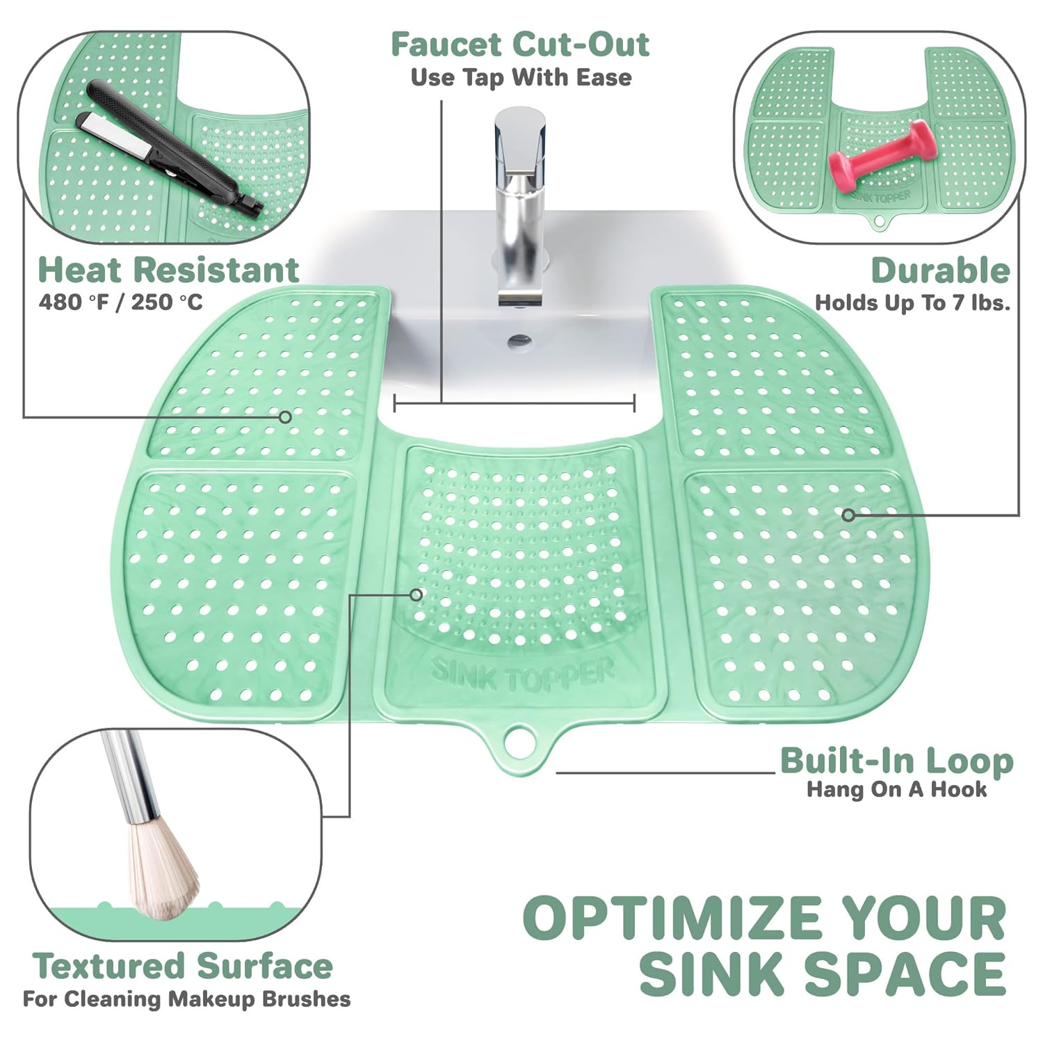 - MULTIPURPOSE SINK SOLUTION – Upgrade your sink area with this foldable silicone topper that adds extra space, protects against heat up to 480°F, and keeps essentials organized. Slip-resistant and strong enough to hold up to 7 lbs, it’s perfect for makeup brushes, hot tools, or cleaning items. Wondering if it fits your sink? Available in Small and Large sizes—just measure before ordering for the best fit at home or while traveling.