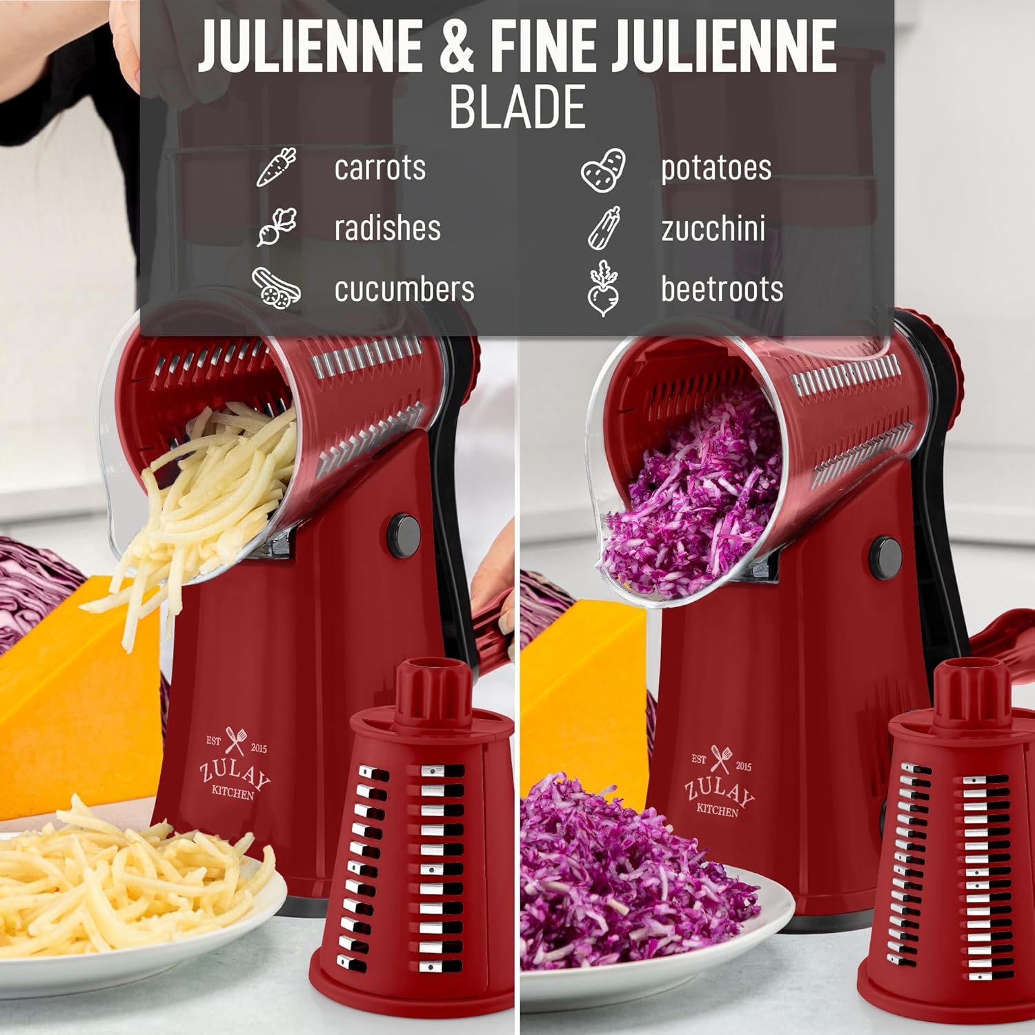 Zulay Kitchen Rotary Cheese Grater 5 Blade Cheese Shredder - Manual Hand Crank Cheese Grater With Reinforced Suction & 5 Interchangeable Drums - Easy to Use, Vegetable Chopper Round Mandoline Slicer