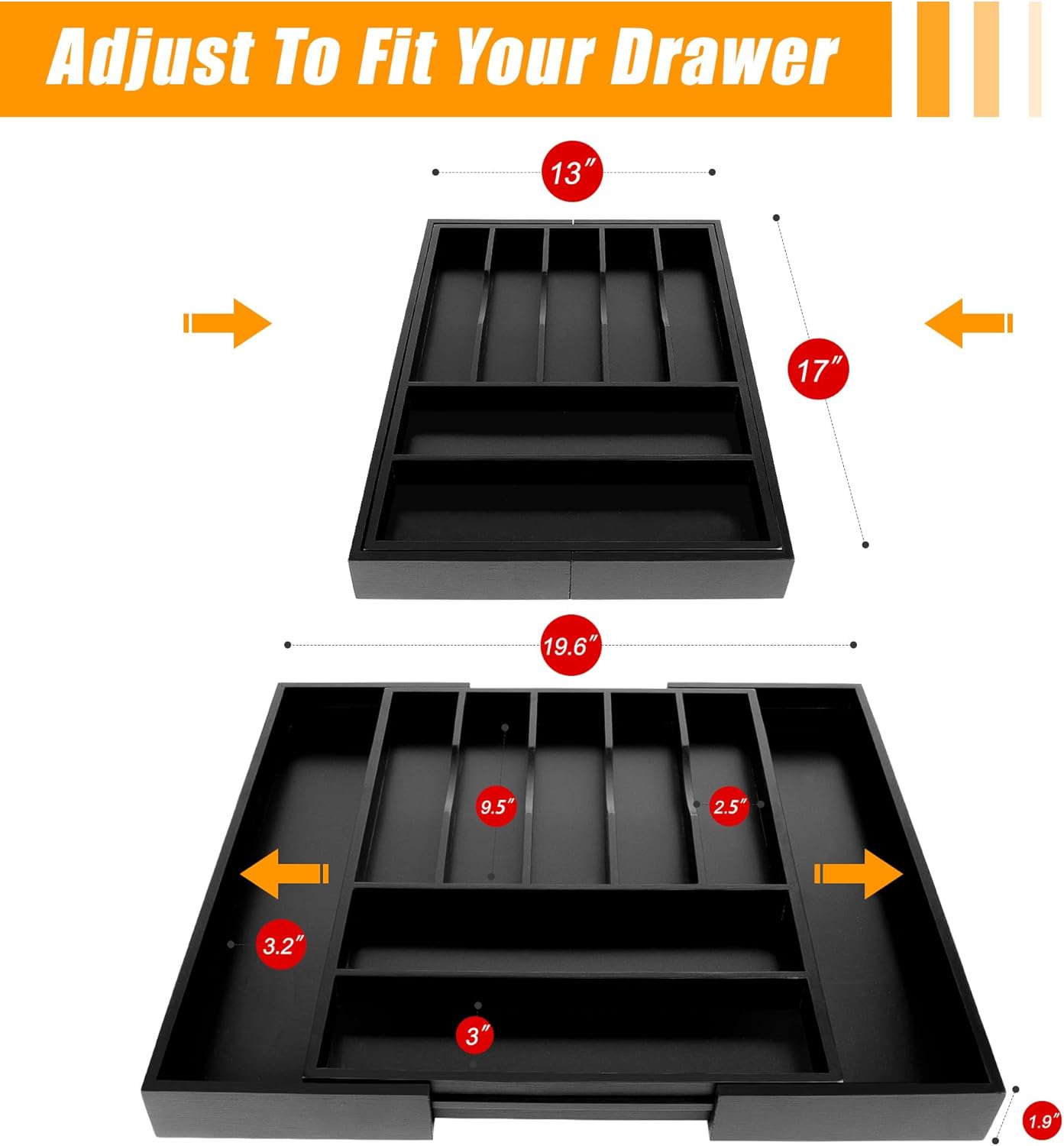 Bellsal Large Premium Bamboo Silverware Organizer - Expandable Utensil Drawer Organizer - 17"x19.6" Utensil Holder and Cutlery Tray with Grooved for Kitchen Flatware and Utensils(7-9 Slot, Black)