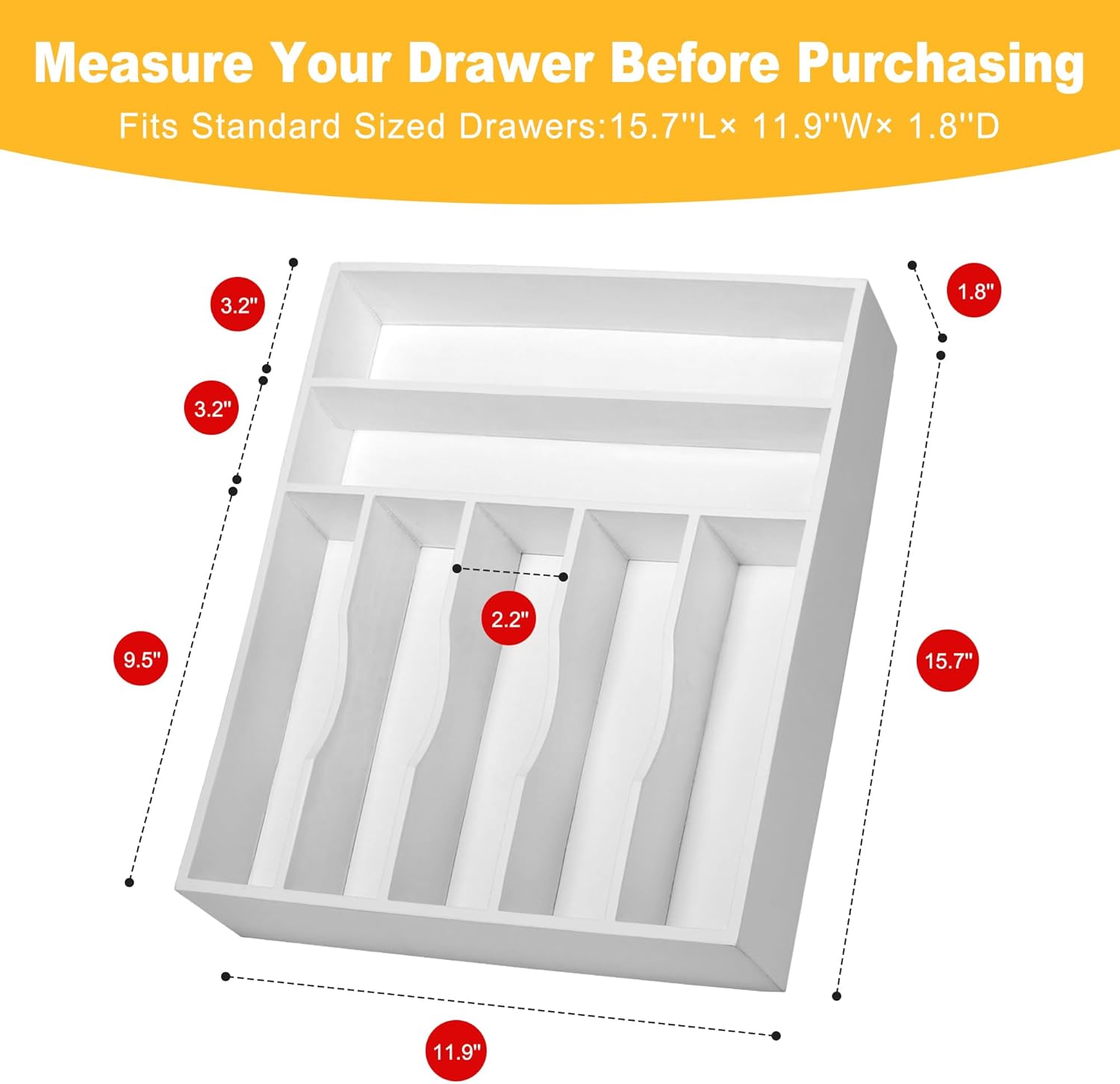 - ✅【Keep Your Home Tidy】It's the solution you've been seeking for those all-too-common piles of utensils and the ever-expanding junk drawer. Transform your cluttered kitchen drawers into oases of order with our bamboo drawer organizer. Sized at 15.7”x11.9", our organizer features seven spacious compartments, each 1.8” deep slots, designed to conveniently organize and store your kitchen cutlery and rearrange flatware for a tidy, clean look.