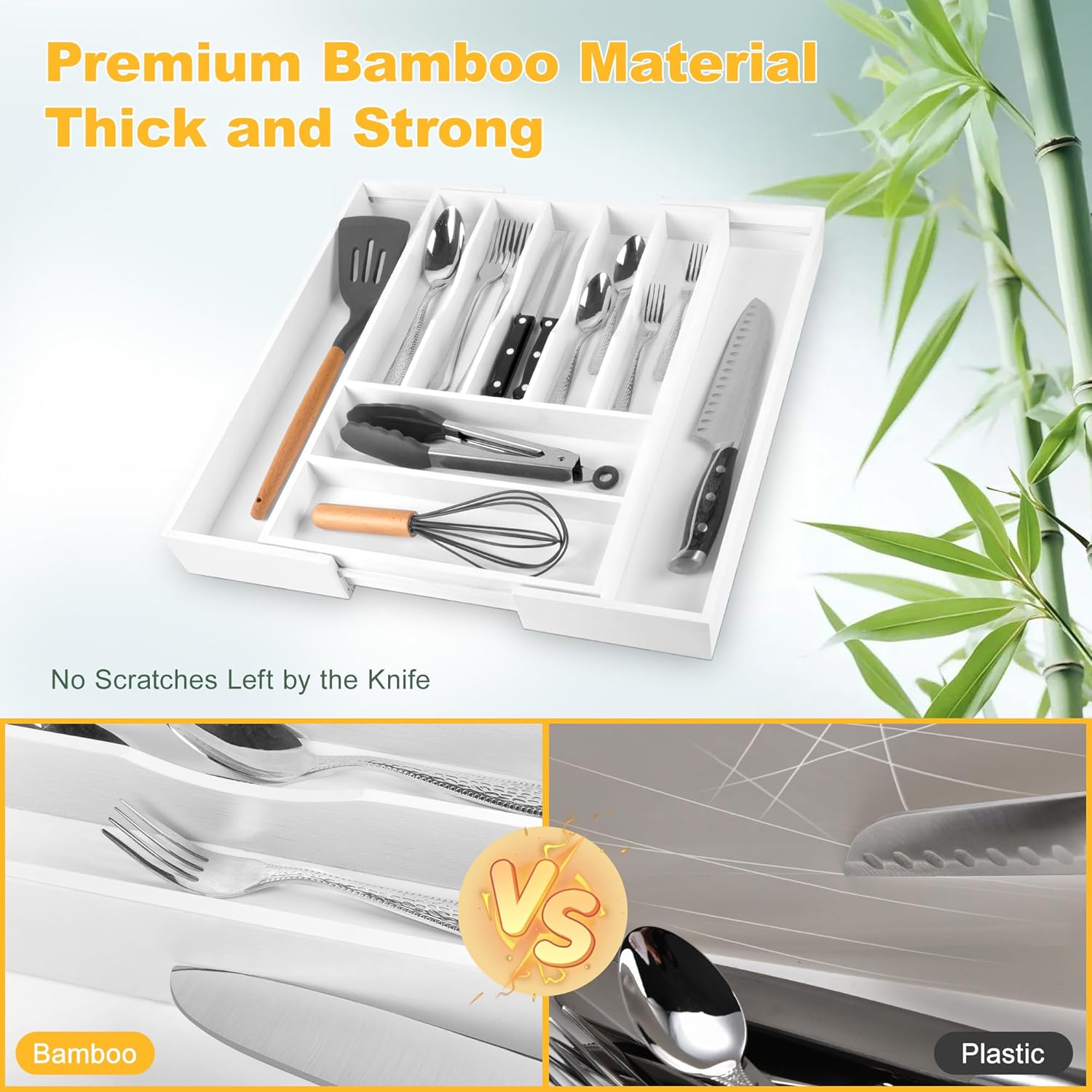 Large Premium Bamboo Silverware Organizer - Expandable Drawer Organizer & Utensil Organizer - 17"x19.7" Cutlery Tray with Dividers for Kitchen Utensils and Flatware (7-9 Slots) (White)