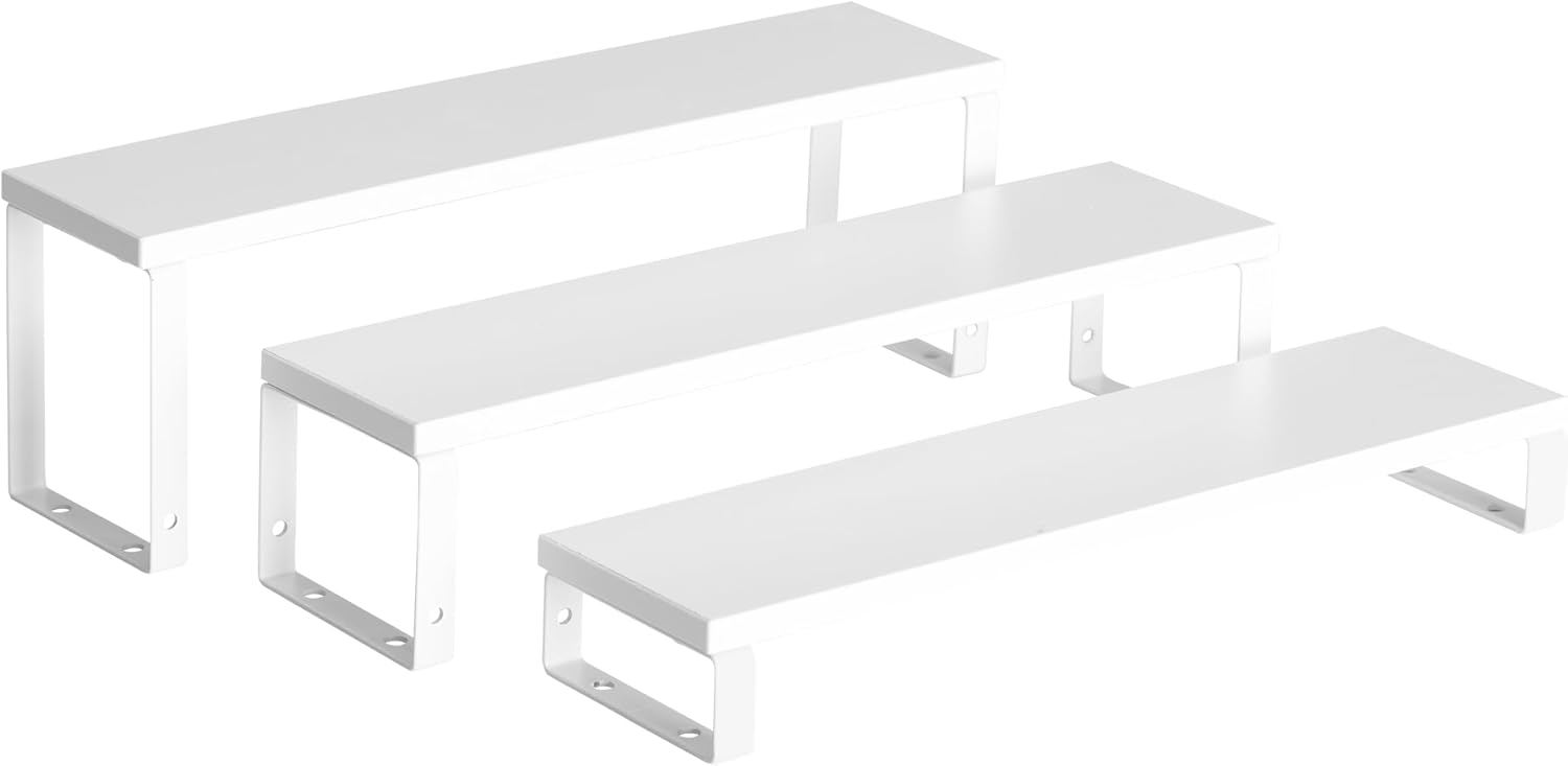 - Quick Setup & Easy Cleaning: You can have this 3-tier display riser stand assembled in 10 minutes with detailed instructions and tools. The wooden surface is waterproof and dust-free, a damp cloth could keep the counter shelf clean. (Assembly tools and accessories are included in the package)