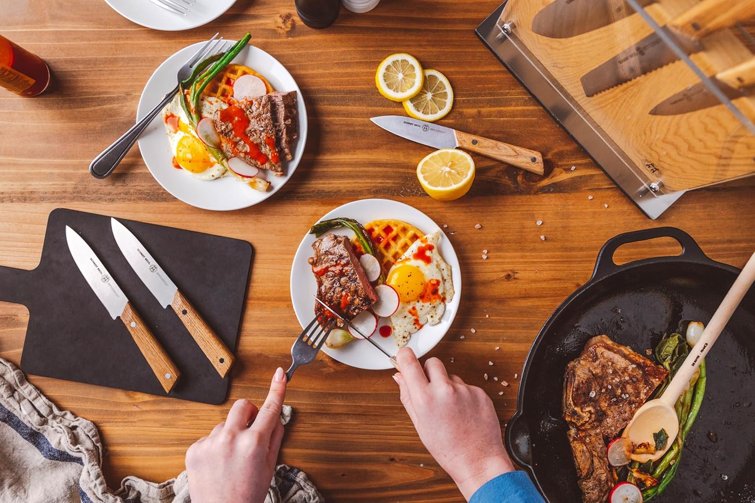 - What you get: Natural White Oak & Acrylic Knife Block, 8" Bread Knife, 8" Chef Knife, 5" Utility Knife, 4" Paring Knife, and four 4.5-inch Steak Knives