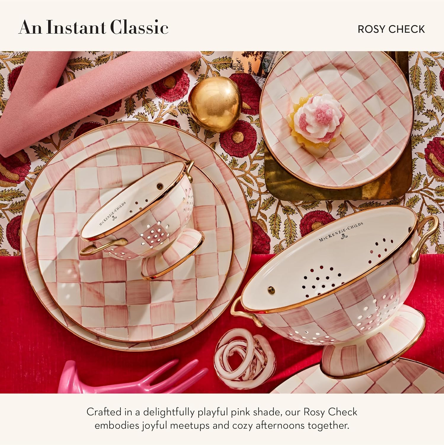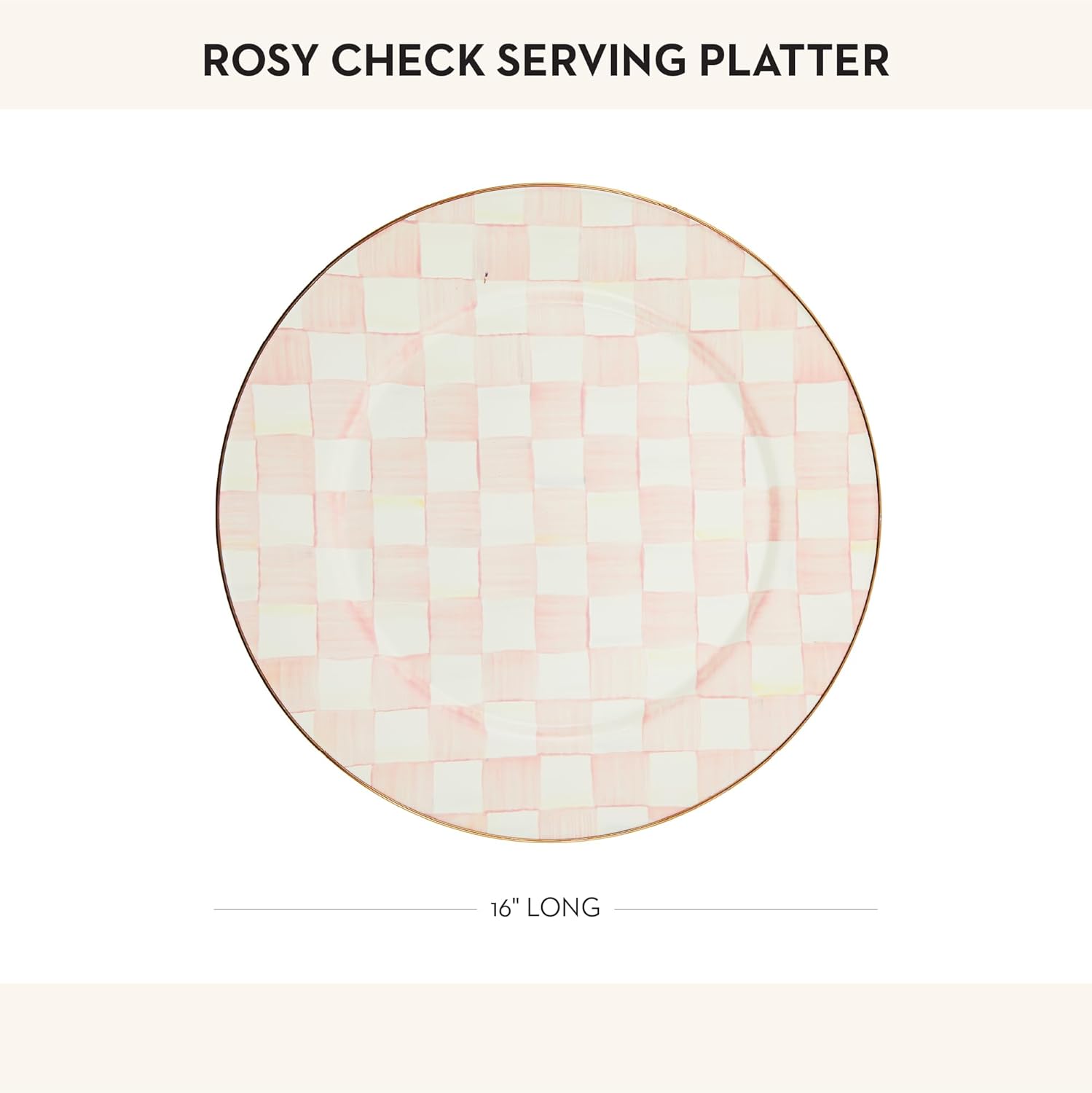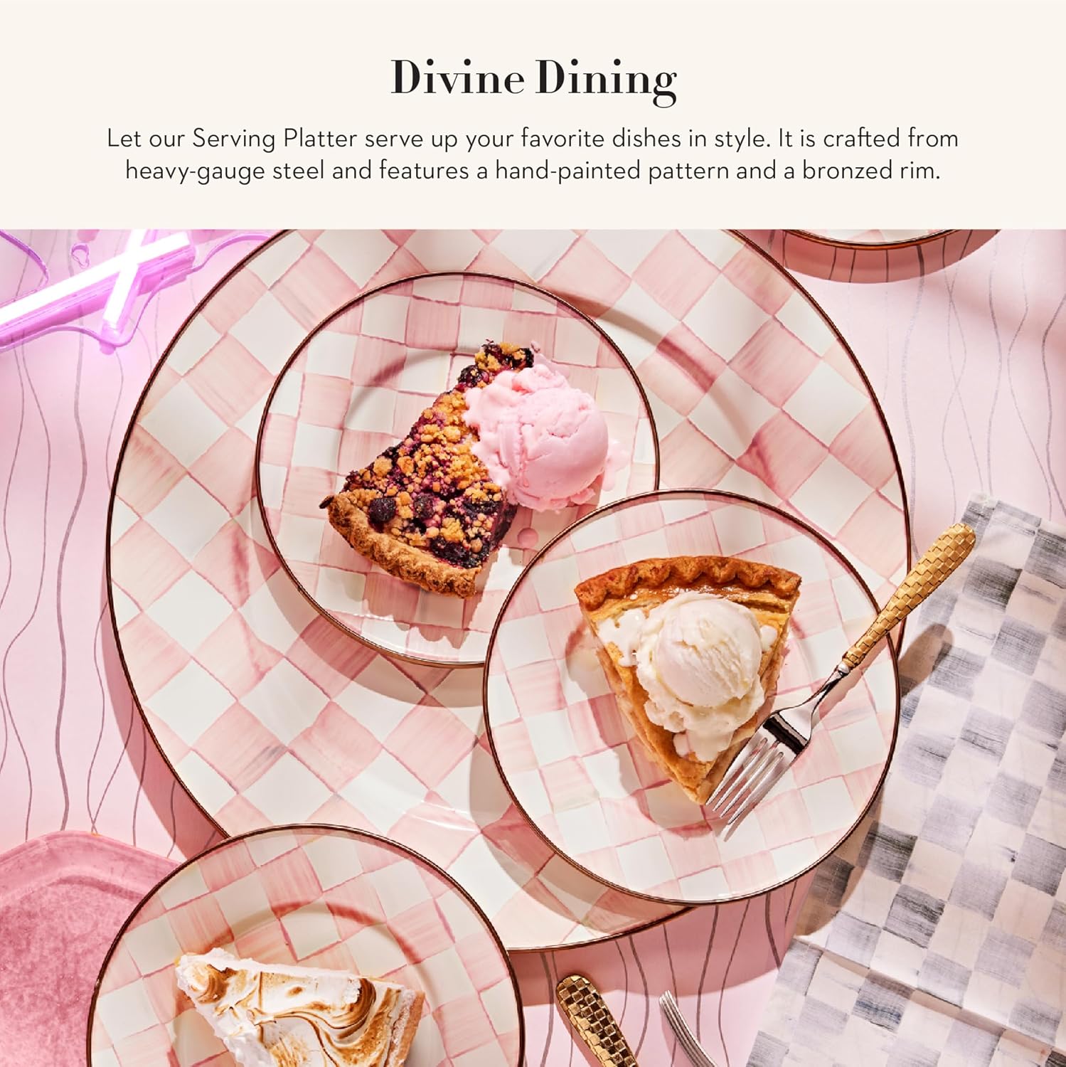 - ENTERTAINING ESSENTIAL: Serving platters for entertaining don’t get any more pretty, pink, or classic than this. Our Rosy Check platter features glossy hand-painted pink-and-white checks in a range of rosy hues and has a hand-glazed heavy-gauge steel underbody and a bronzed stainless-steel rim.