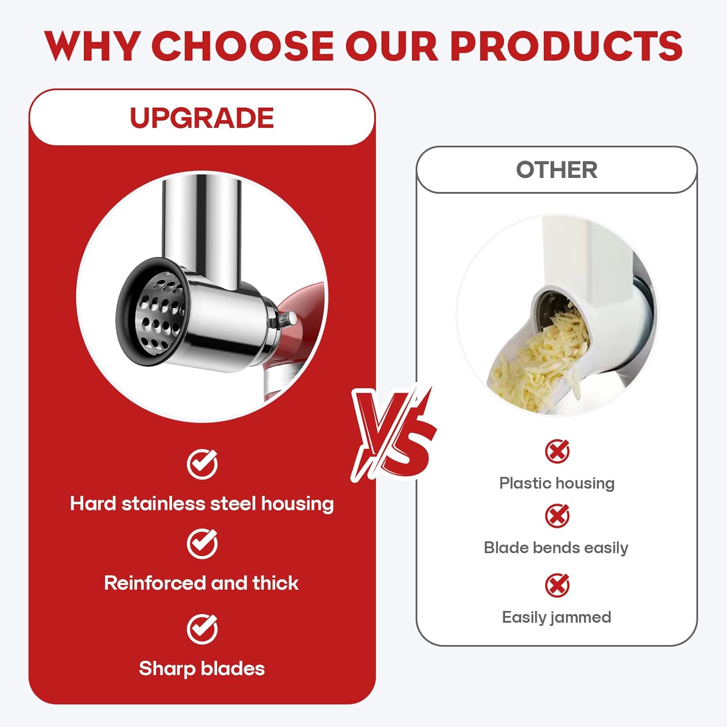 - Easy to Clean: The kitchen aid accessories and attachments are straightforward to clean. The inward-facing blades prevent you from injuring your hands during cleaning, making cheese shredder easy to thoroughly clean each blade and accessory. They are dishwasher safe, leaving more time for your favorite cooking and enjoying delicious food.