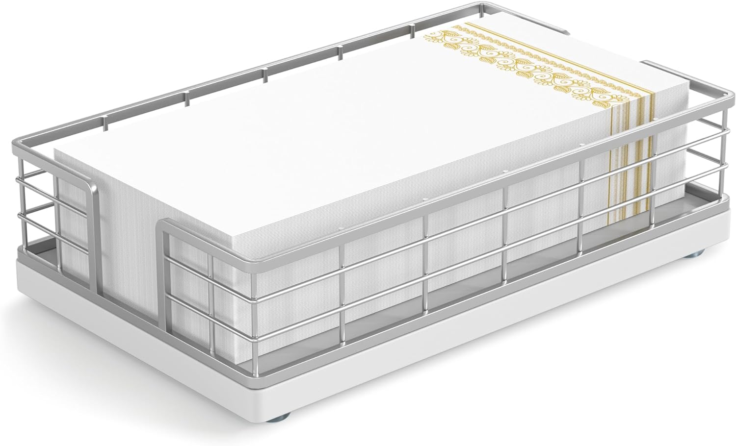 Wican Guest Towel Holder Tray for Bathroom, Oak and Iron Napkins Holder for Powder Room Dinning Table Wooden Basket for Disposable Paper Hand Towels Silvery and White