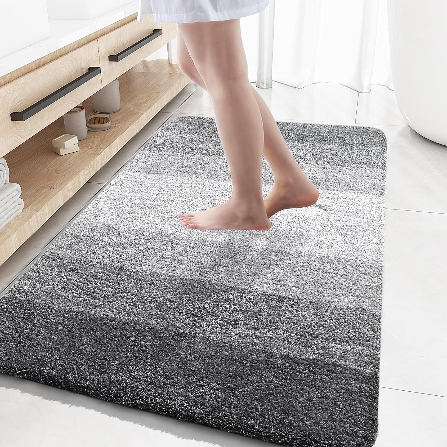 - [Luxuriate in Pure Comfort] Indulge your feet in the softest, coziest microfiber imaginable. With its plush pile, nearly one inch thick, our bath mat soothes and warms your feet, protecting them from the cold floor below. Enhance your bathroom decor with OLANLY's captivating bath mat. The gradient color stripe design seamlessly merges stripes, creating an eye-catching pattern that infuses sophistication into your space.