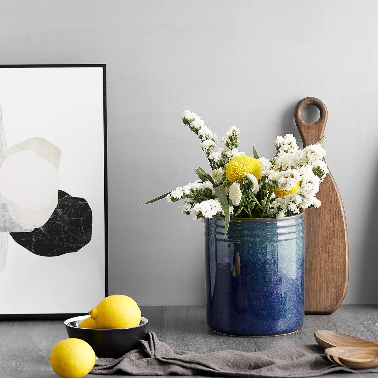 - Wonderful & Elegant Gift. Made of great quality, this utensil holder for countertop is very sturdy, and can be used for kitchen and be used as a planter pot. The hand-make beautiful and elegant relief with brown stripes on the edges, suitable for wedding or housewarming gifts.