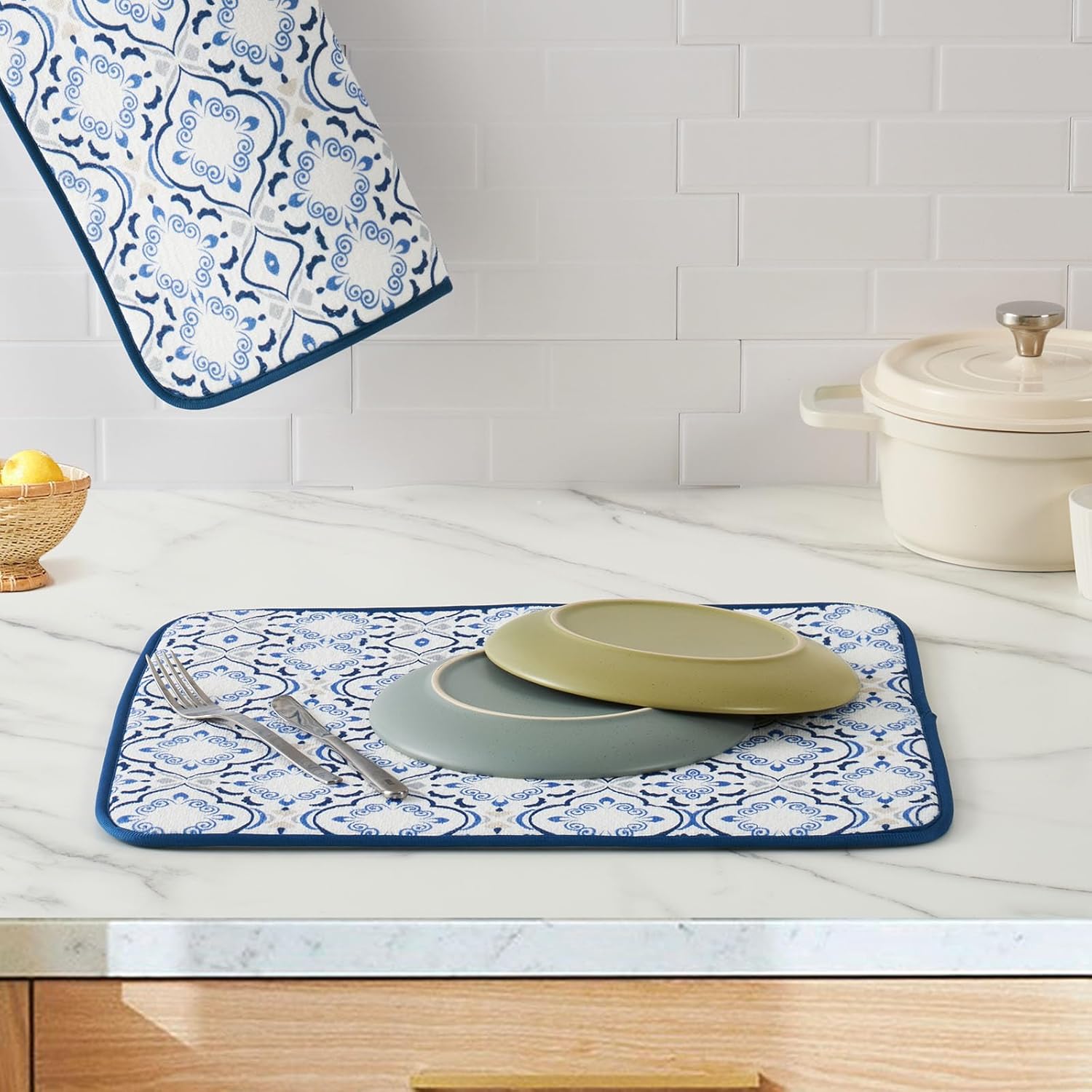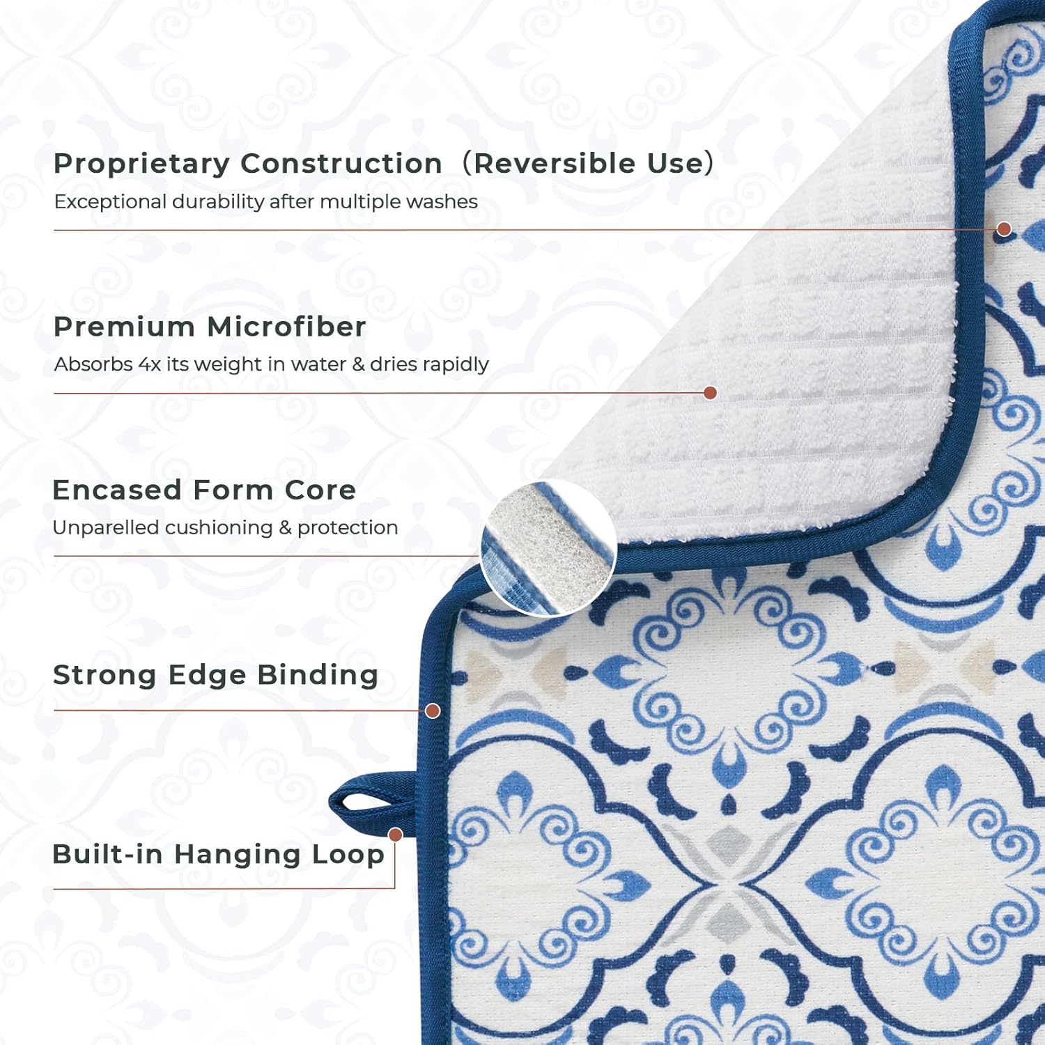 FRESHMINT Printed Dish Drying Mats for Kitchen Counter 2 Pack Absorbent Reversible Drying Mats Microfiber Kitchen Countertop Protector Dishes Drying Pad Extra Large 18"x16" Dish Mat