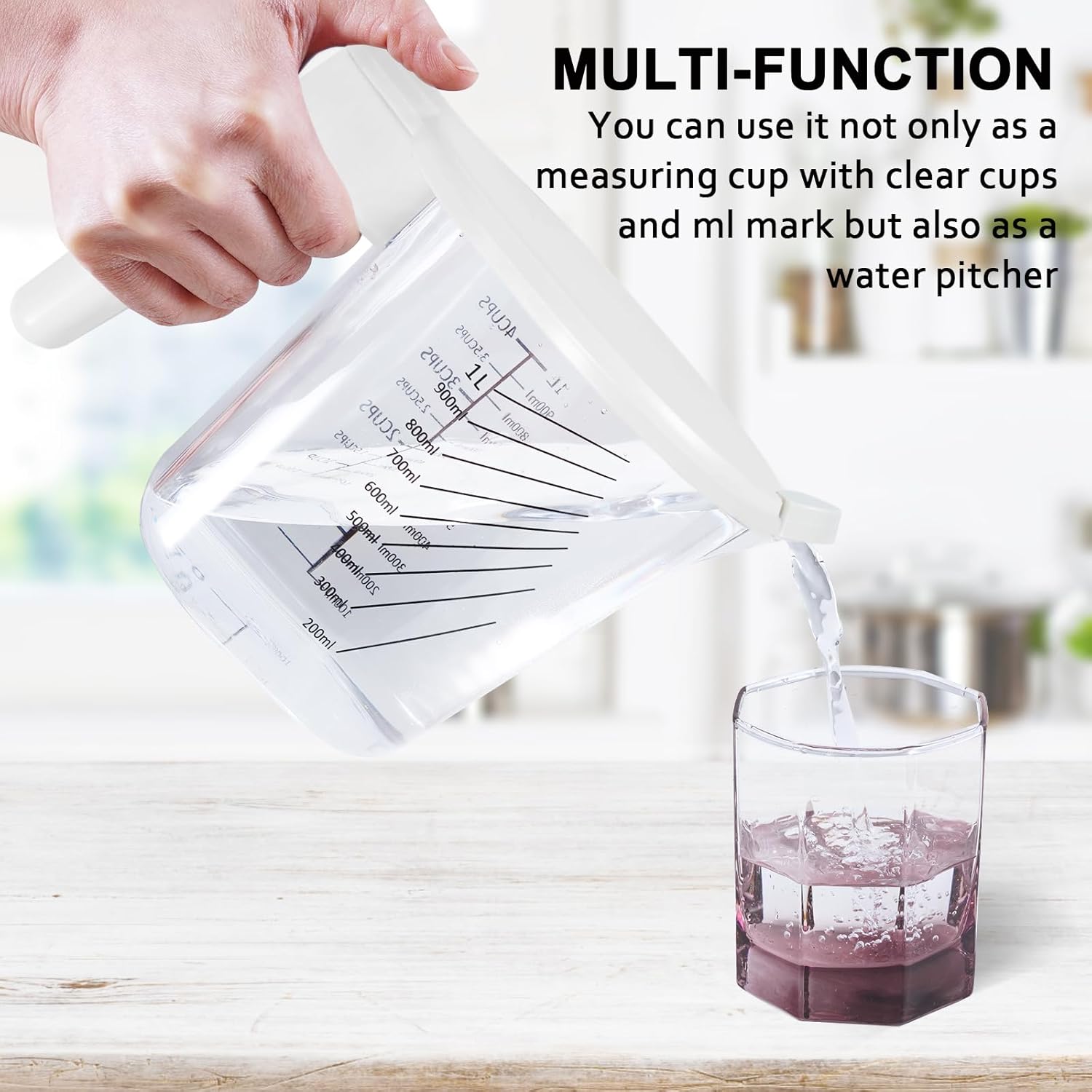 - 【Multi-Function】The measuring cup features a lid and spout, making it not only a measuring cup with clear cup and milliliter markings, but also a water pitcher. This makes it perfect for multiple uses in the kitchen, helping you save time and space.