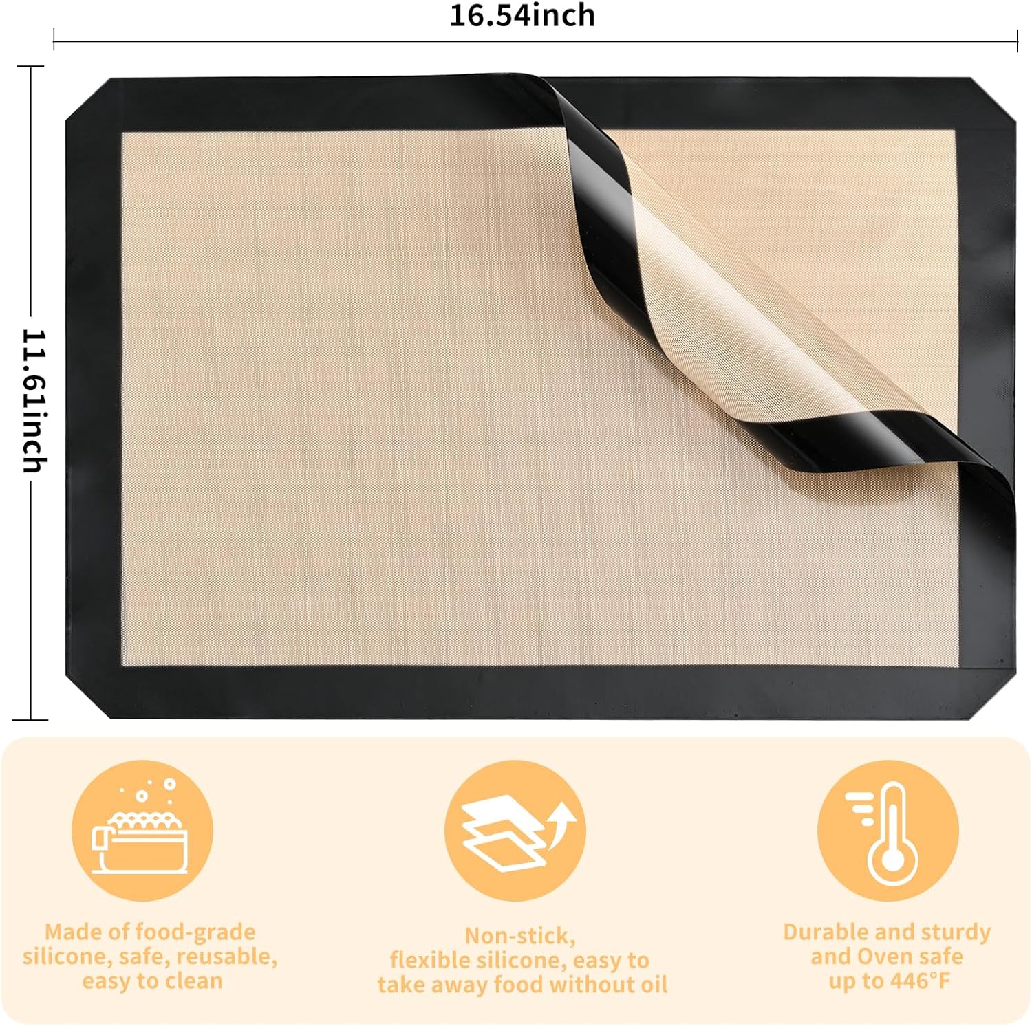 - Perfect Fit for Half Sheet Pans: Sized at 16.54" x 11.62", these reusable silicone baking mats fit all standard half sheet trays. Ideal for baking cookies, bread, pastries, or roasting vegetables — no parchment paper or foil needed.