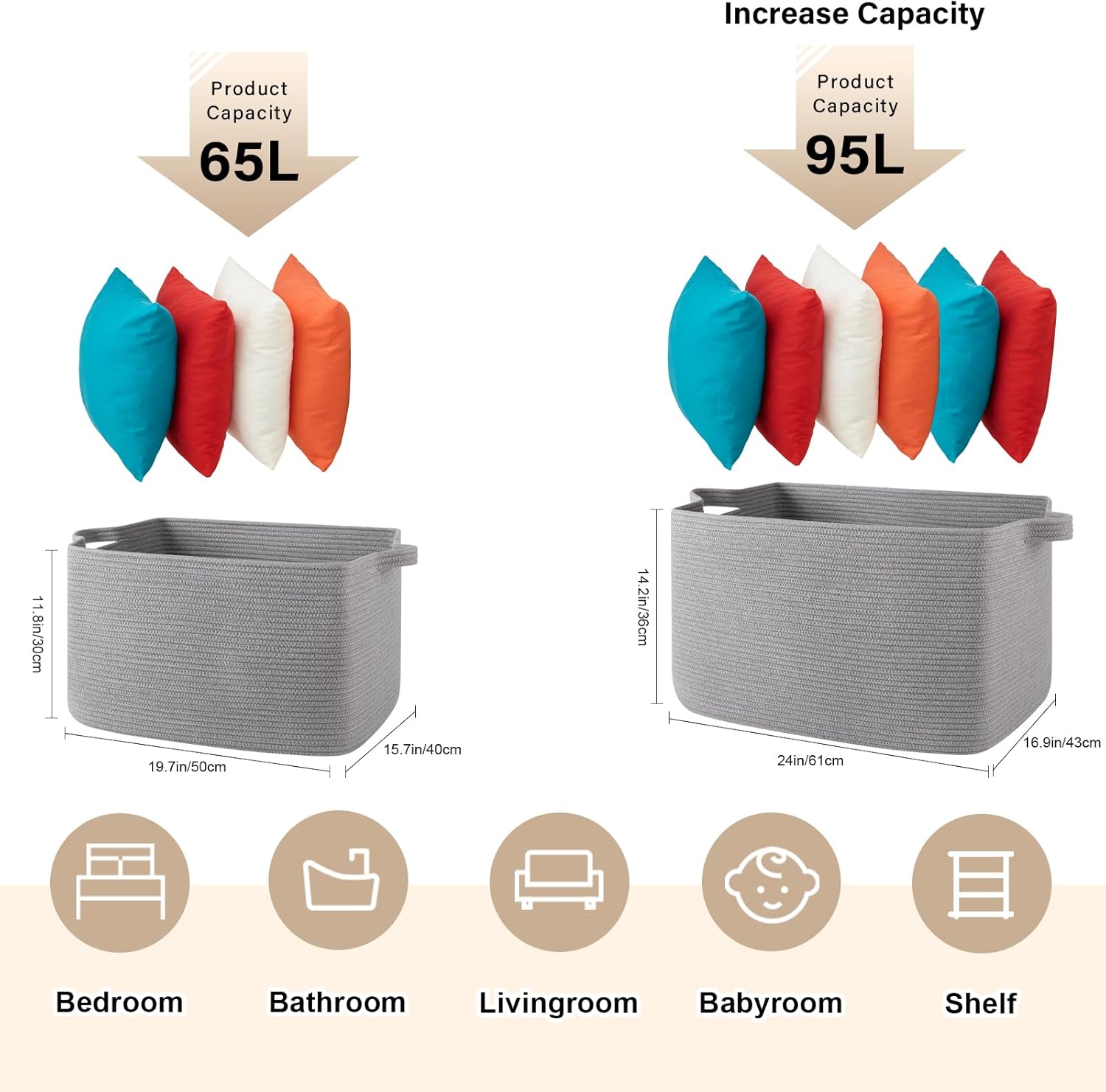 - Large Storage Basket: 65L large storage basket, perfect for throwing pillows, cushions, blankets, comforters, toys, and clothes. Keep the toy basket in the kid's room, family room, or any room in the house that could use extra storage: fits on a closet shelf, bookshelf, etc