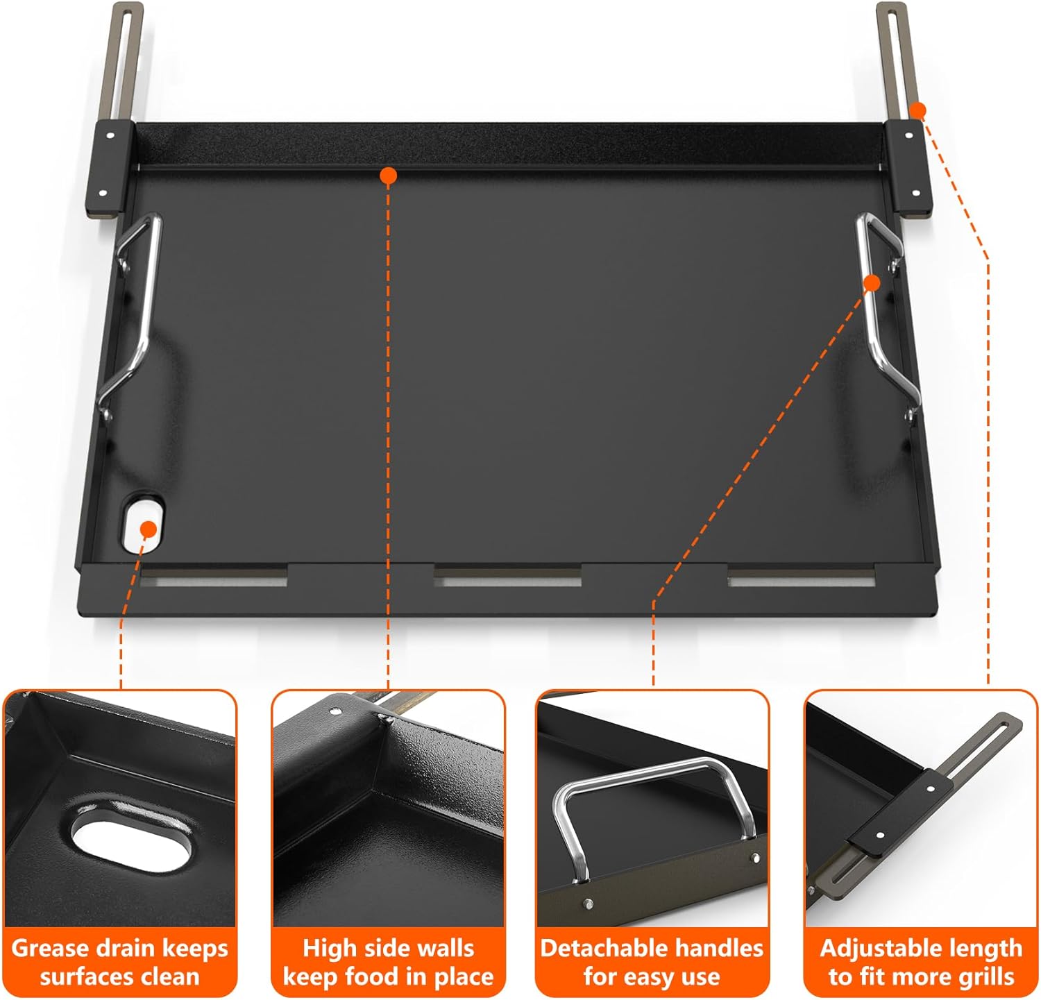 - Easy Cleanup: Large grease hole to drain grease and debris, prevent splattering and keep cooking surfaces clean. Features side handles for easy conversion or removal from the grill.