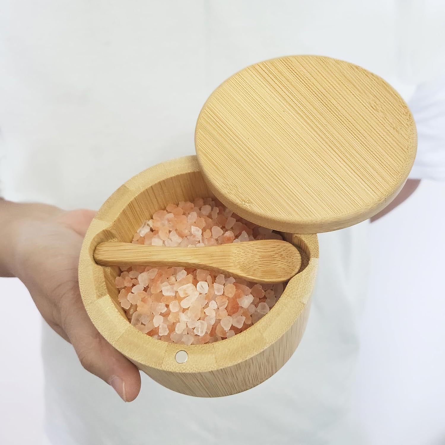 - Built in Spoon:The bamboo salt box with swivel lid comes with a built in spoon,and the size of the spoon is very convenient for you to control the amount of salt used,with it,cooking becomes simple,just like a chef