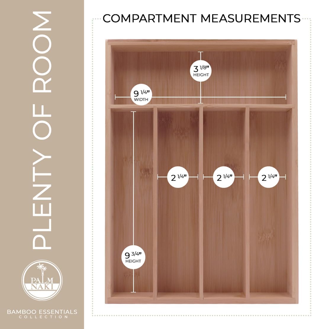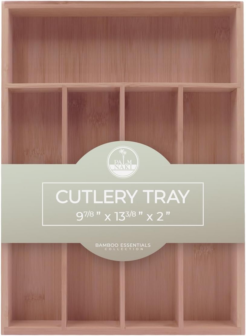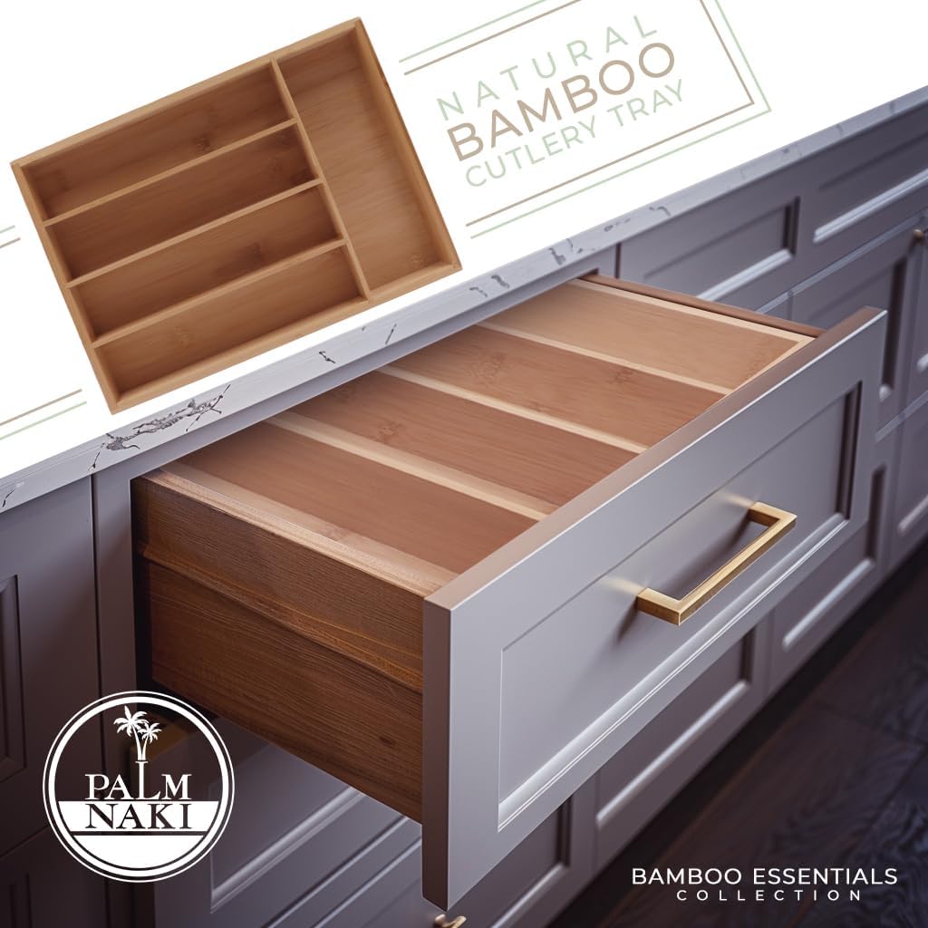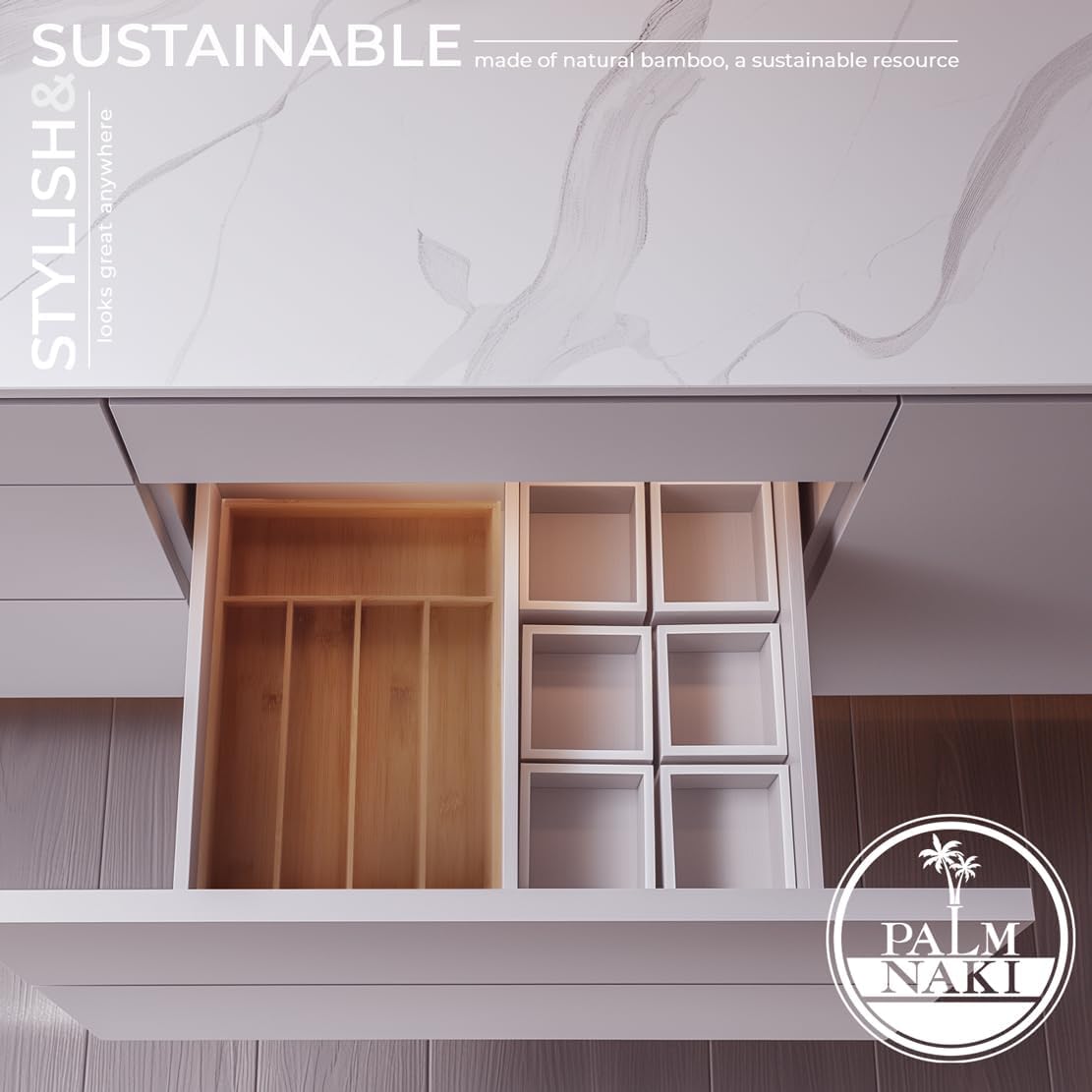 - ๐ฟ Transform Your Space with Elegance and Efficiency - Discover the ultimate solution to declutter your drawers and beautify your home with Palm Naki's premium bamboo cutlery tray. Designed with precision, our organizer features expansive compartments tailored to fit drawers of any size, ensuring a custom fit that brings harmony and accessibility to your kitchen, office, or vanity.