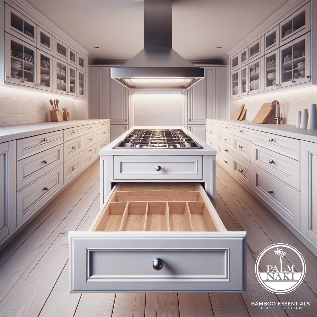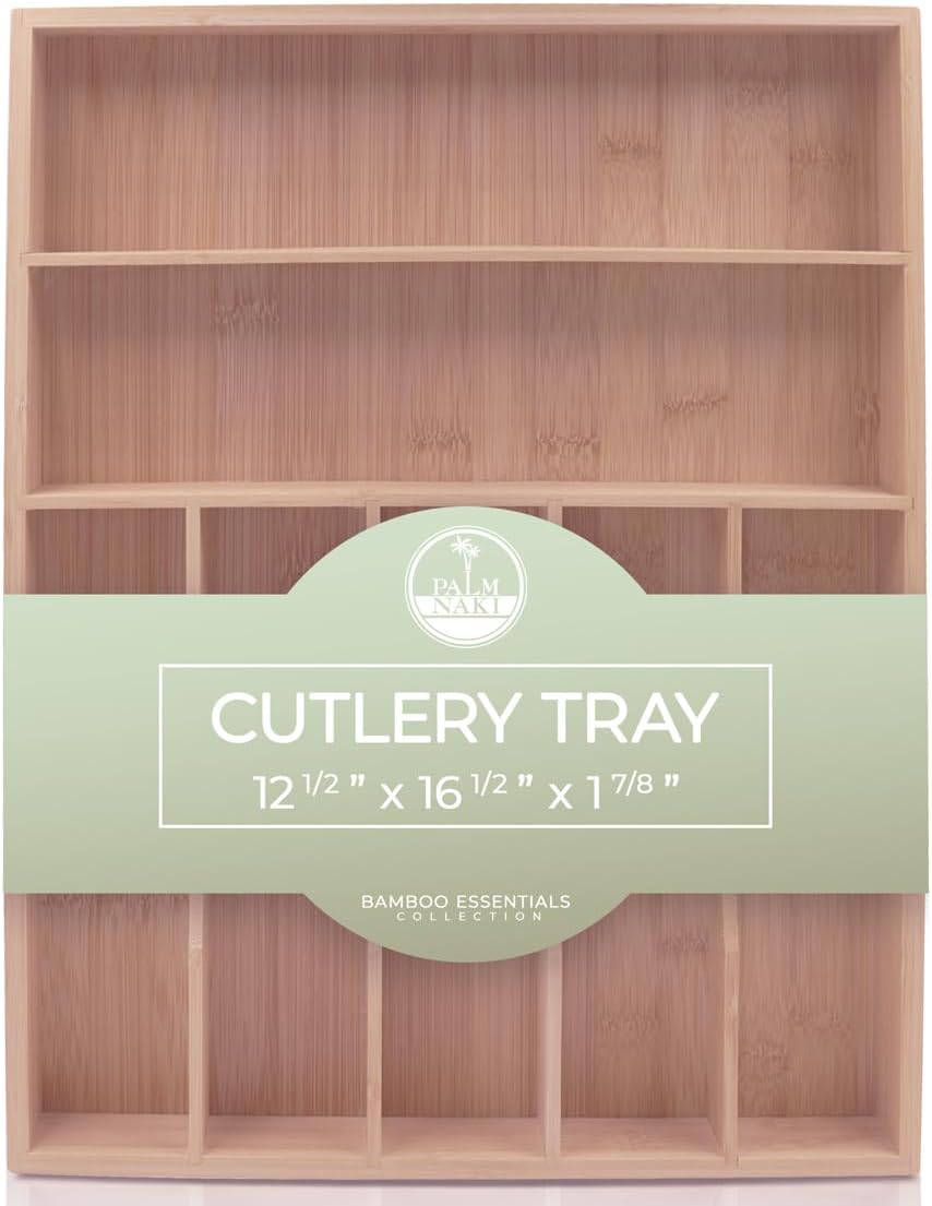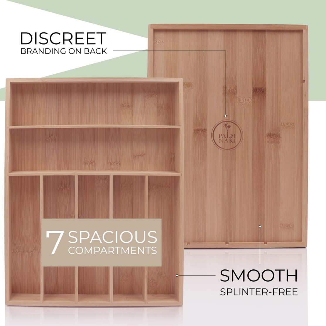 - ๐ฟ Transform Your Space with Elegance and Efficiency - Discover the ultimate solution to declutter your drawers and beautify your home with Palm Naki's premium bamboo cutlery tray. Designed with precision, our organizer features expansive compartments tailored to fit drawers of any size, ensuring a custom fit that brings harmony and accessibility to your kitchen, office, or vanity.
