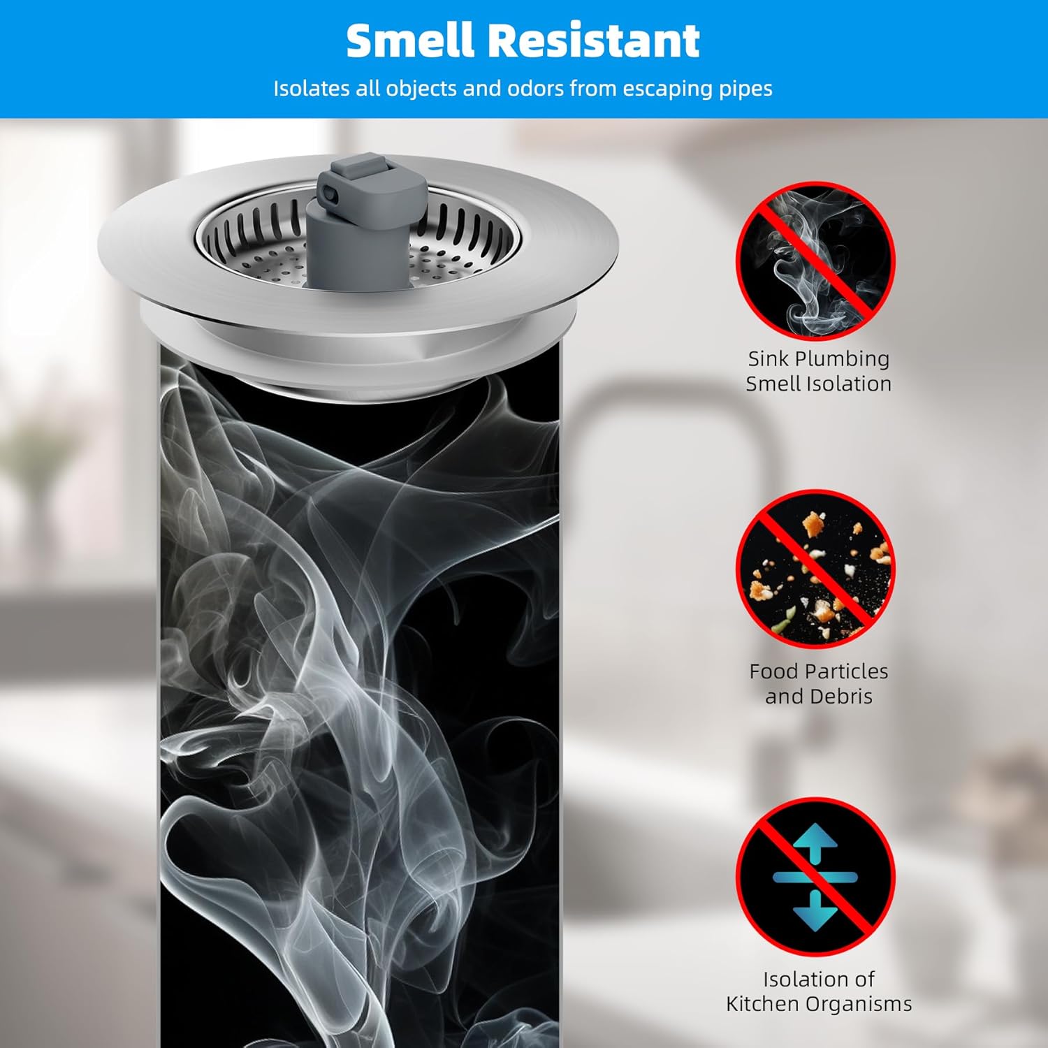 - Versatile 3-in-1 Design: This sink strainer combines water storage, strainer and odor isolation; With multi-layer sealing gaskets, this sink stopper ensures leak-proof water storage while effectively isolating kitchen drain odors; It can be used to fill the sink with water for cleaning and soaking purposes; The perforated basket allows easy filtration of kitchen waste without impeding water flow, which can easily captures food, waste and debris to prevents clogging in kitchen pipe