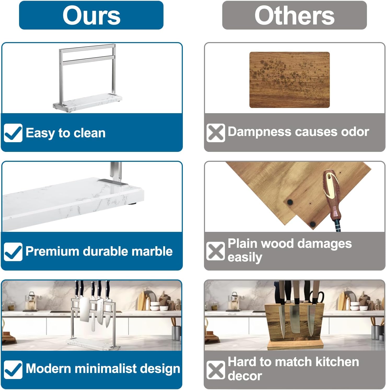 - 【Simplified Cleaning Experience】Merging the sleek look of stainless steel with the timeless charm of marble, this knife holder is not just visually appealing but also incredibly easy to maintain. Its rust-resistant properties and ease of cleaning guarantee a lasting, pristine appearance with minimal effort
