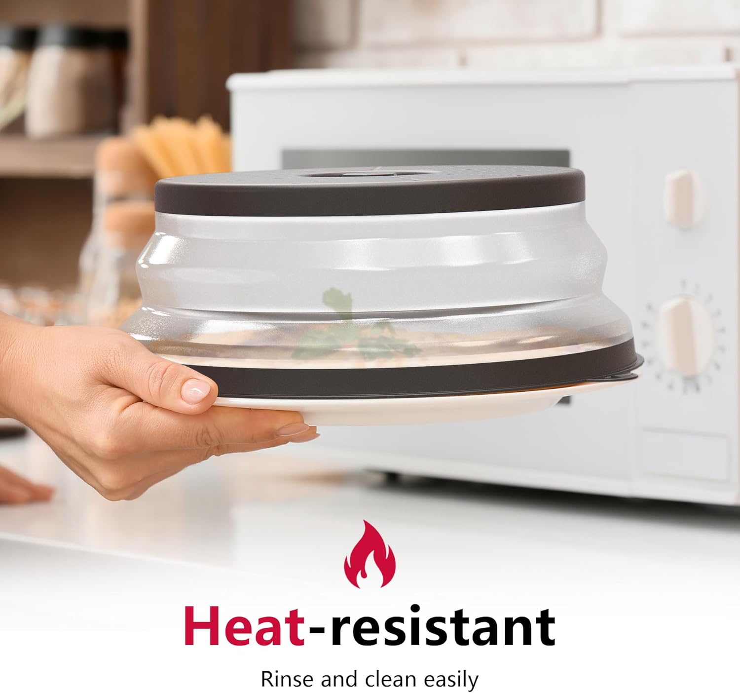 - Microwave Cover: The collapsible microwave cover promotes even cooking and features a vented lid to keep your microwave clean. It measures 10.5 inches by 3.2 inches and fits over most plates and bowls.