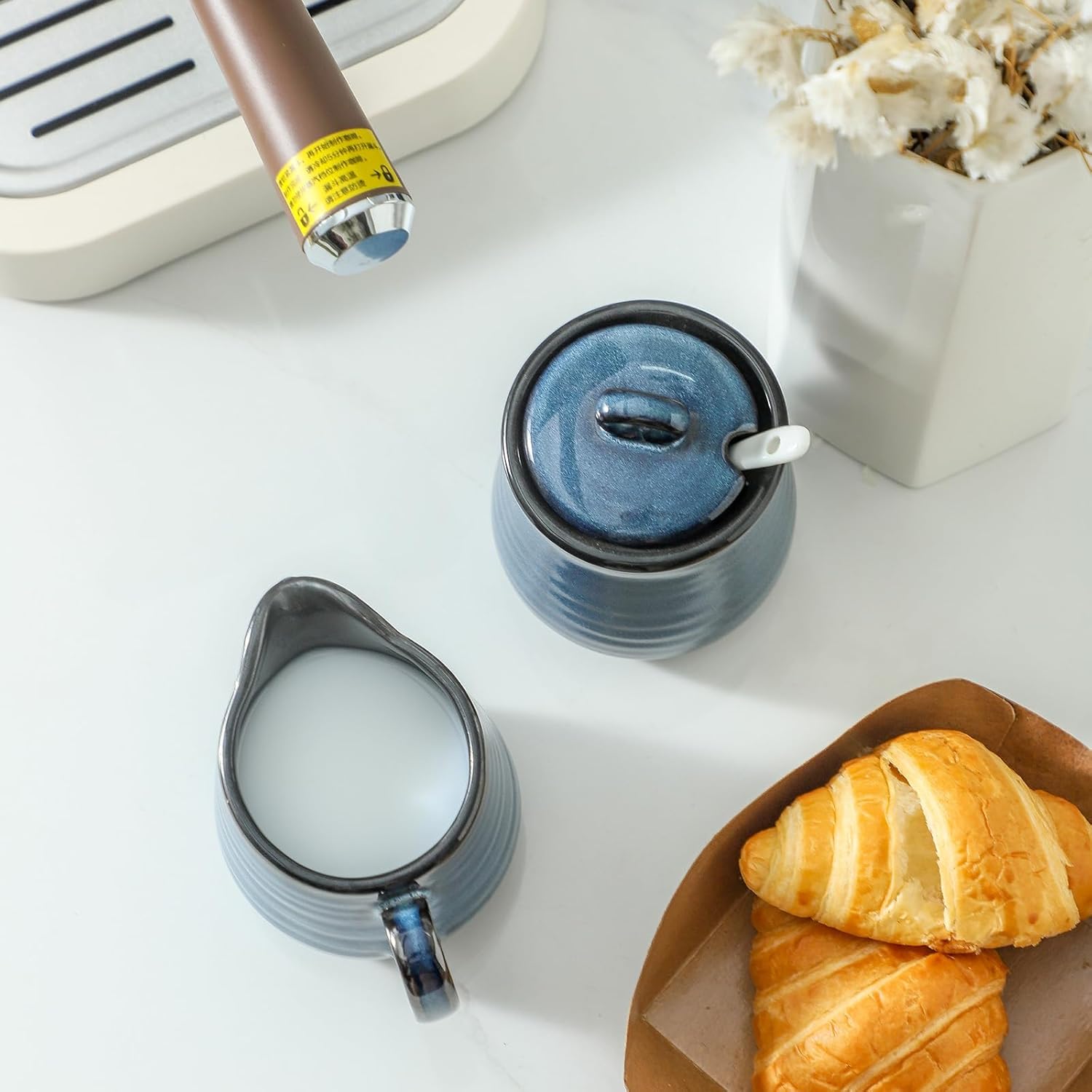 Glowworm Porcelain Sugar and Creamer Set, 11 Ounce Sugar Container, 10 Ounce Cream Pitcher, Farmhouse Coffee Sets for Serving, Dishwasher Safe, Blue