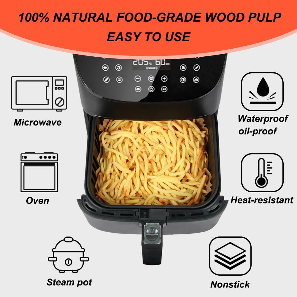 - PREMIUM FOOD GRADE MATERIAL: Made from 100% food-grade pulp with a food-grade nonstick coating, unbleached, nonstick, grease-proof, waterproof, and non-absorbent, these air fryer parchment paper liners are 100% safe for daily use.