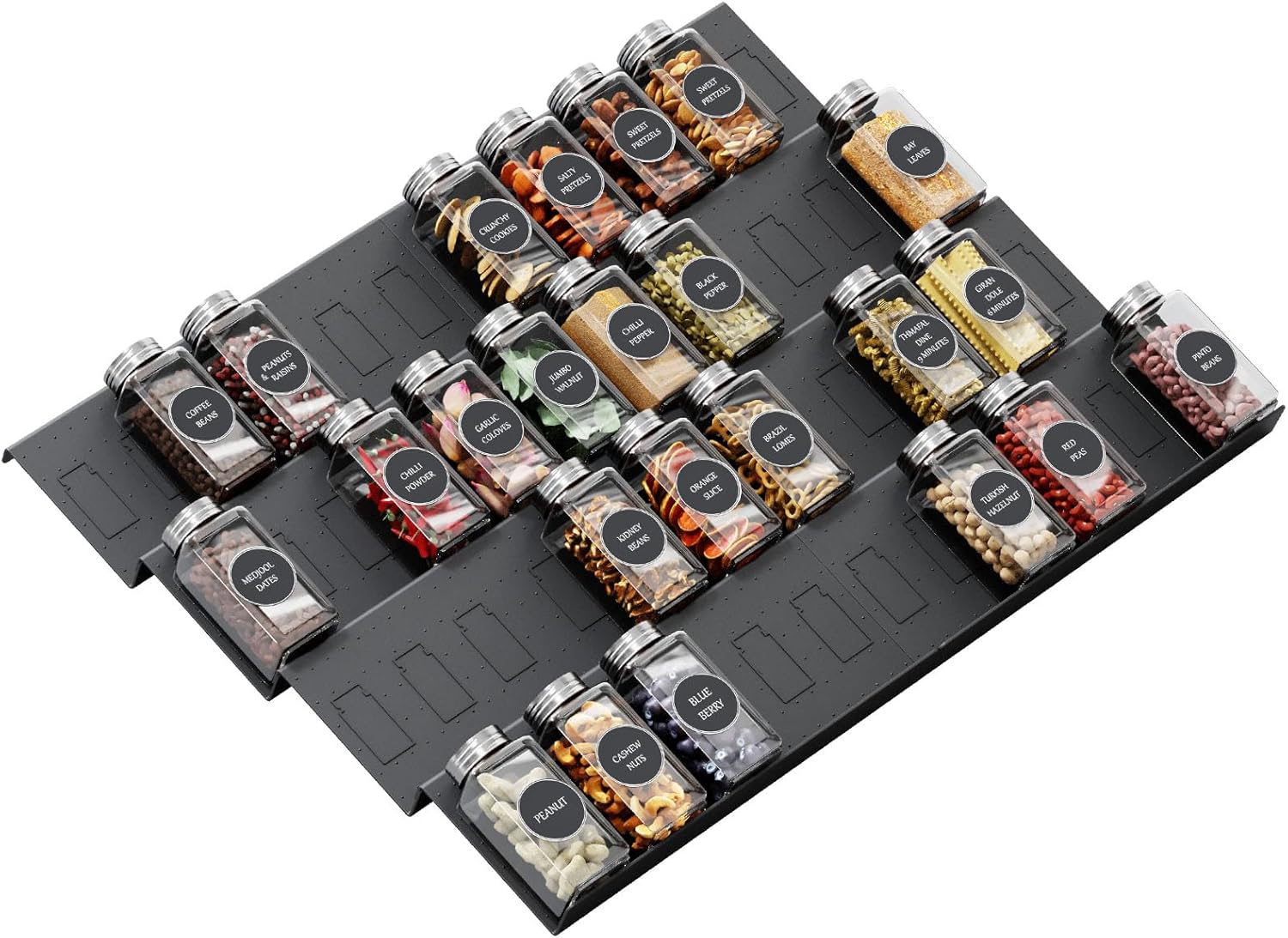 - 8PCS Spice Drawer Organizers: This spice drawer organizer set consists of 8 single slanted drawers that can hold up to 48 spice jars. The slanted design allows you to see all your spices at a glance, saving you time fumbling through the drawers.