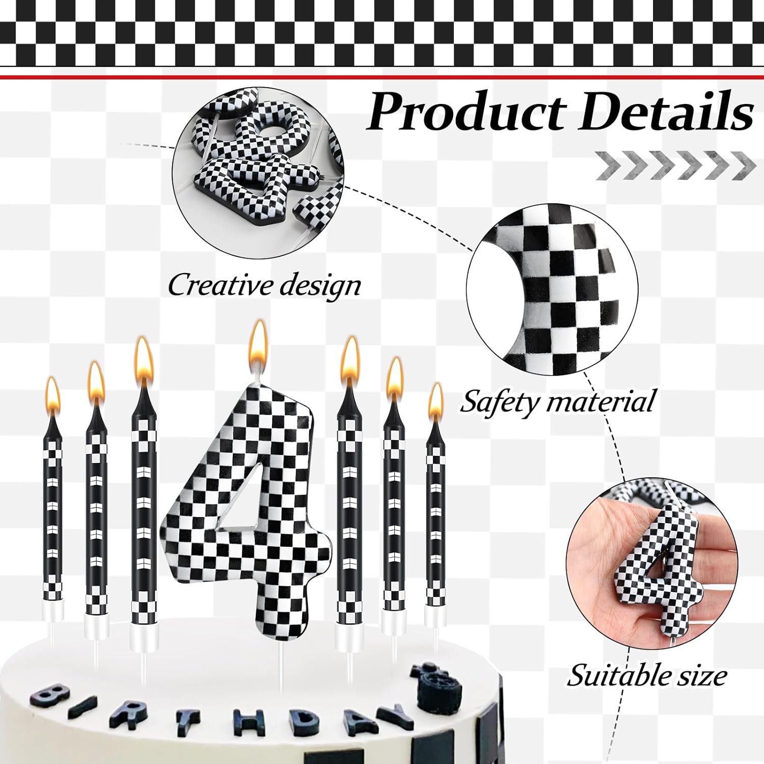 - The Package Includes: You will receive 12 black and white track car themed birthday candles and 1 number 4 black and white checkered candle, Sufficient quantity for birthday cake decoration or party celebration and daily use, note: the candle will slowly melt as it burns, and it is recommended not to leave it on the cake for more than two minutes