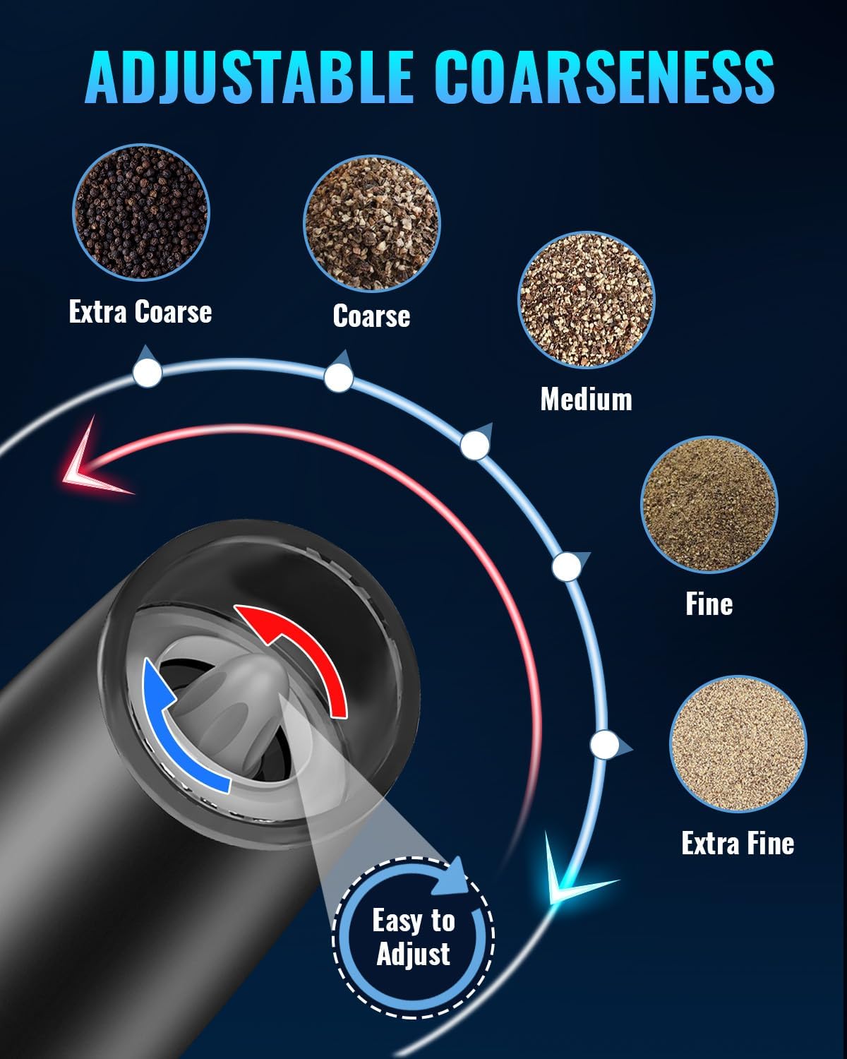 XinXu Rechargeable Pepper and Salt Grinder Set, No Battery Needed, whit Gravity Sensing Switch and LED Light, One Hand Automatic Operation -2 Pack/Black