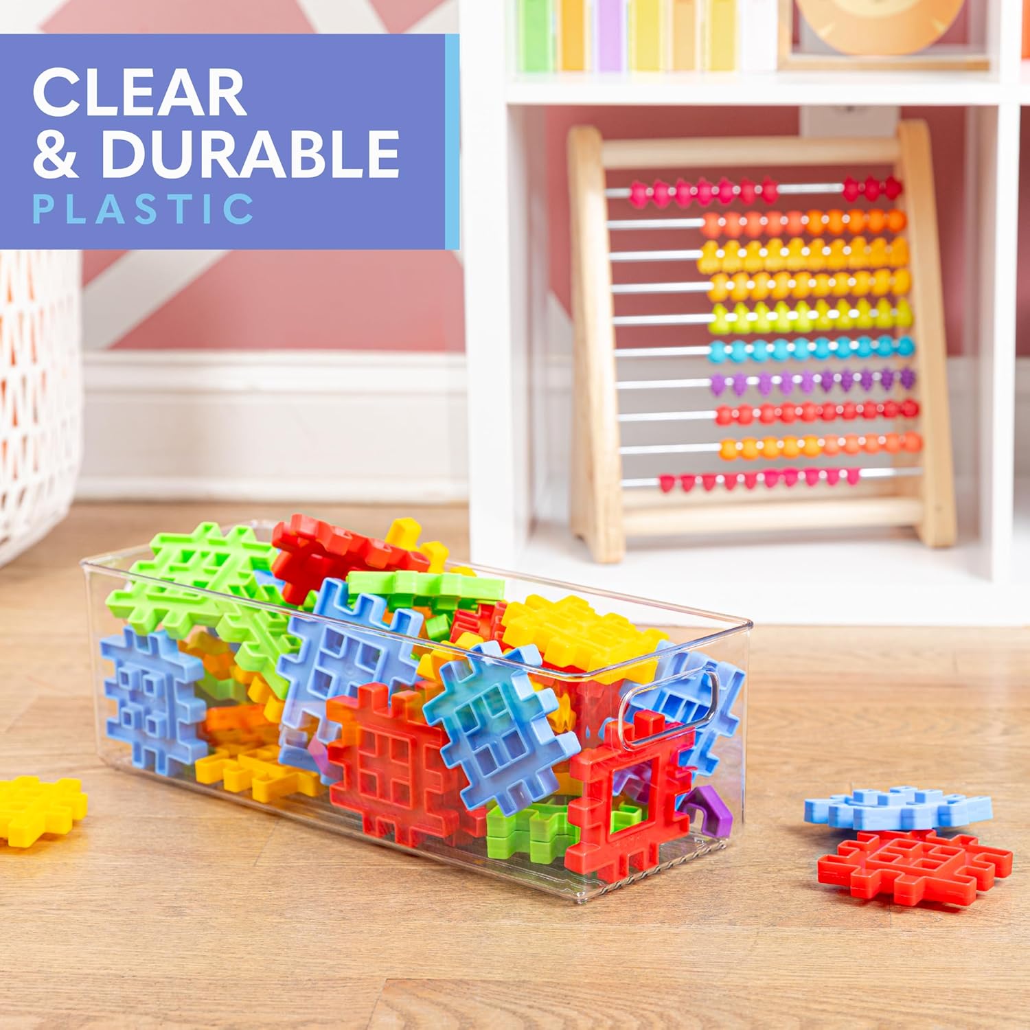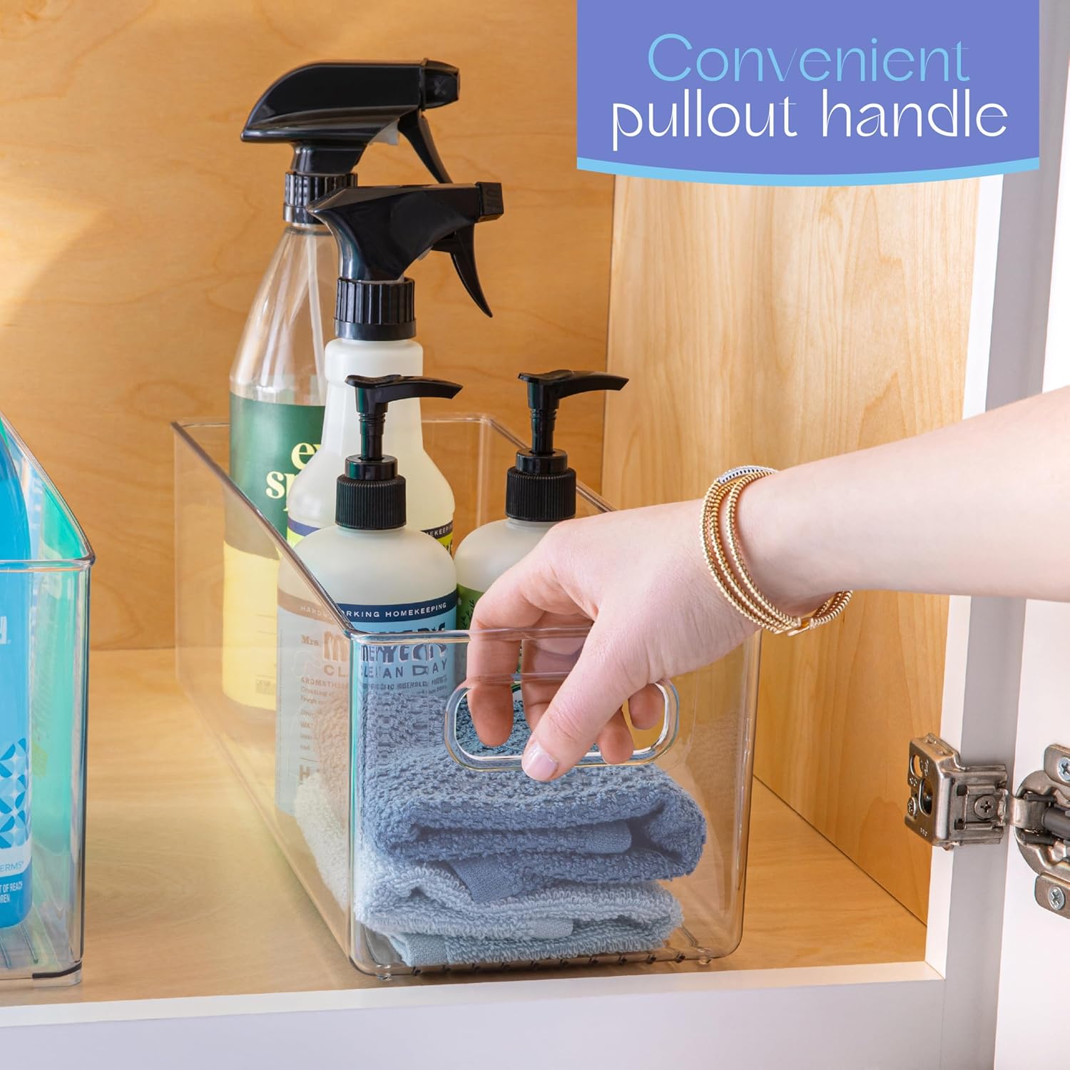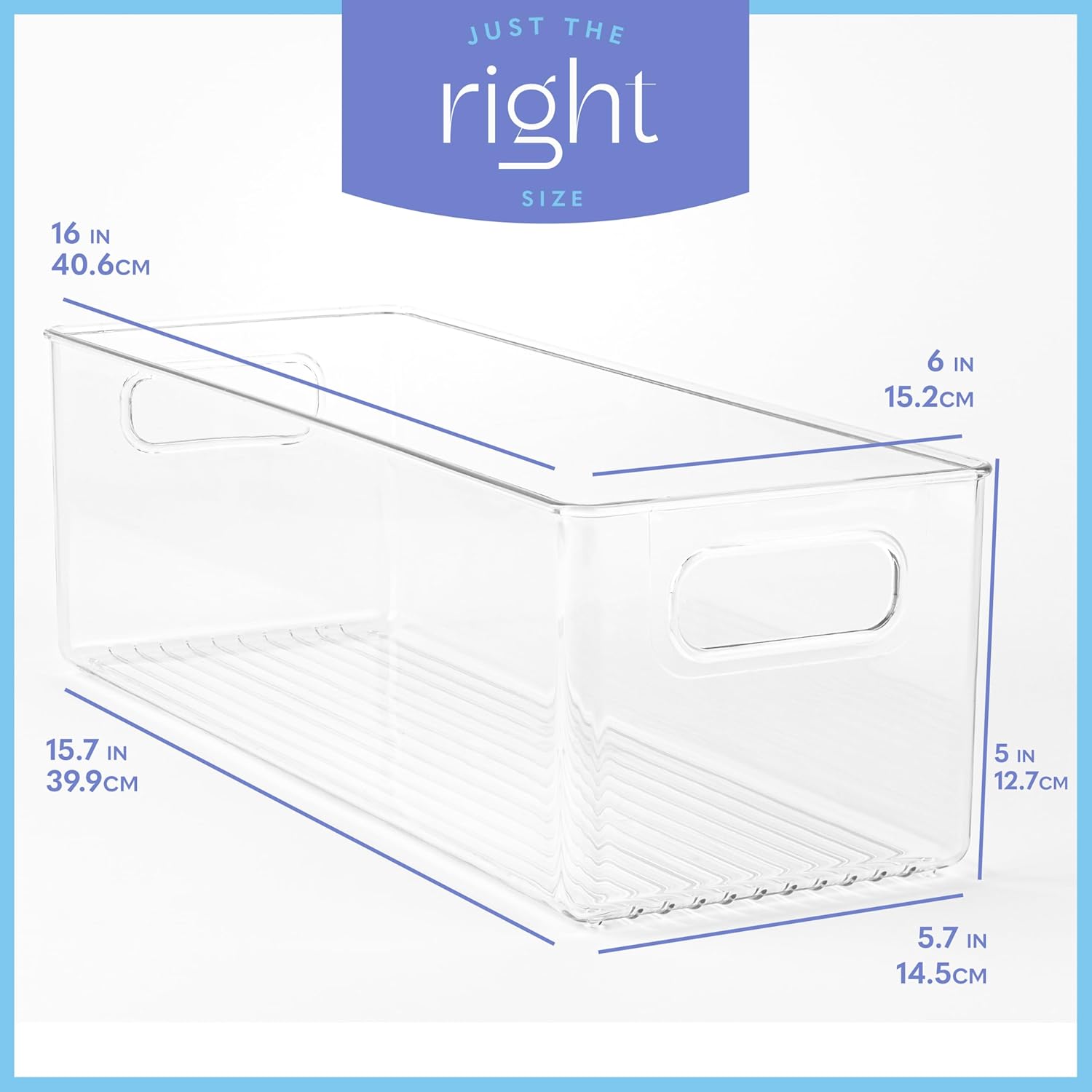 Plastic Food Storage 4 Pack Clear Container Bin with Handles for Organizing Kitchen, Pantry, Refrigerator, Freezer, Pantry, Cabinet, Closet, Bathroom. 16”x6”x5”