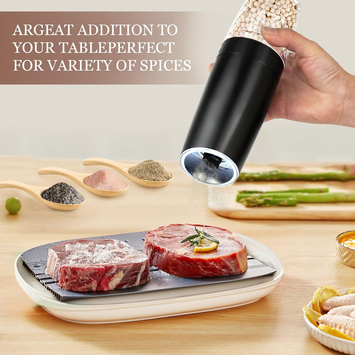 - 【INNOVATIVE DESIGN】The clear diamond-shaped acrylic (BPA-free) compartment allows you to easily identify condiments to avoid confusion. With the LED light, you can easily see how much pepper, salt and other seasonings are in your food. The housing is made of sturdy ABS material that is durable without the risk of glass breakage.