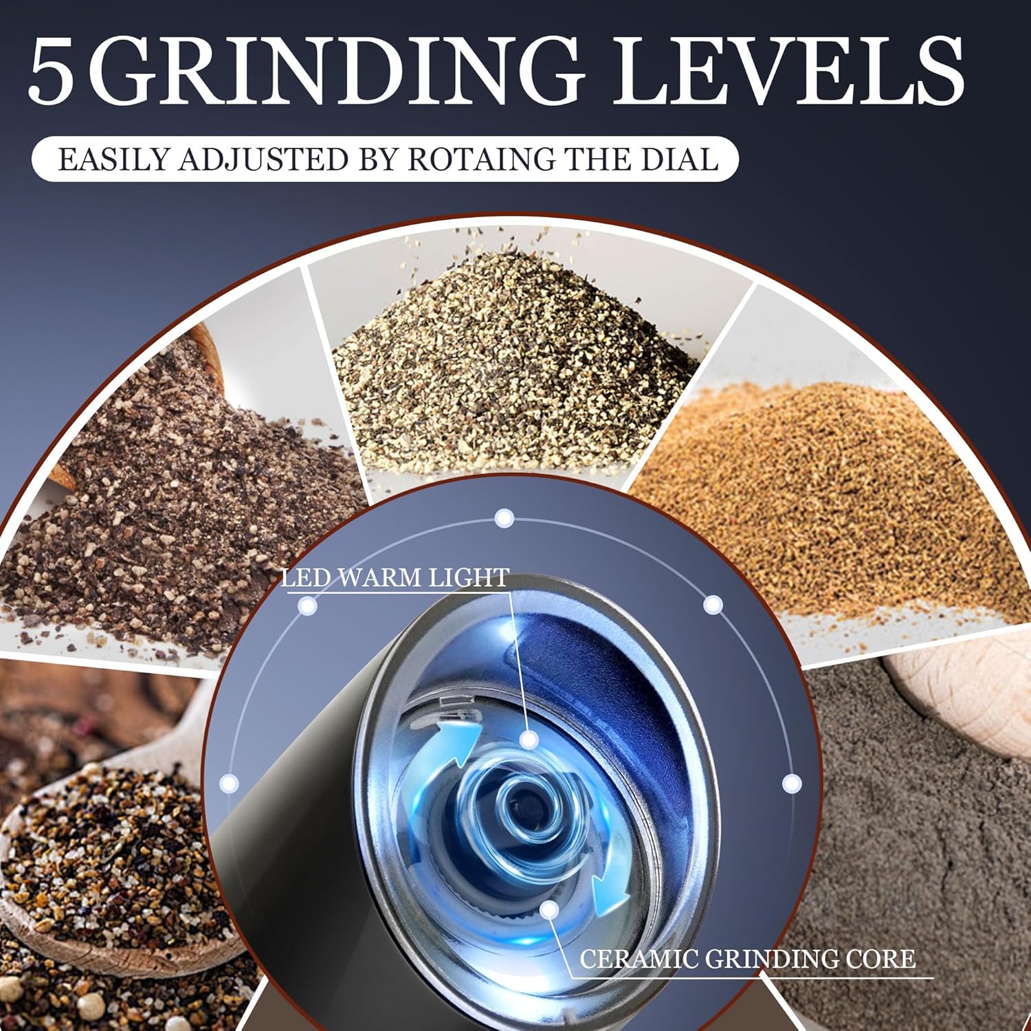 - 【ADJUSTABLE COARSENESS】The electric salt and pepper grinder set can be easily adjusted the coarseness and fineness by rotating the bottom, clockwise rotation for fine particles, counterclockwise rotation for coarse particles, so feel free to choose the size of the particles you need, it is a better kitchen utensil.