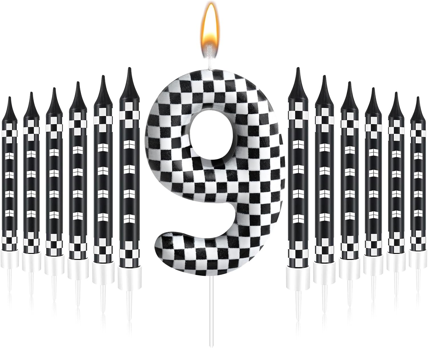 13 Pcs Racing Cars Themed Birthday Candles Black and White Race Number 9 Checkered Candle Cake Topper for Racing Car Party Decoration Supplies (Number 9)