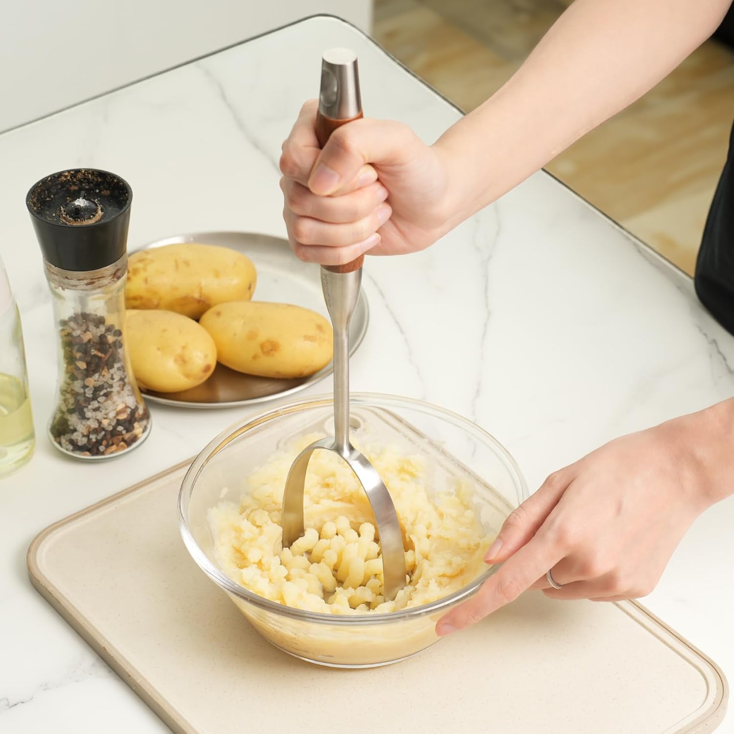 - VERSATILE MASHER: It's called a potato masher, but its utility extends far beyond that. This stainless steel masher can crush beans, eggs, and any fruits or vegetables you desire, such as squash, berries, and more.