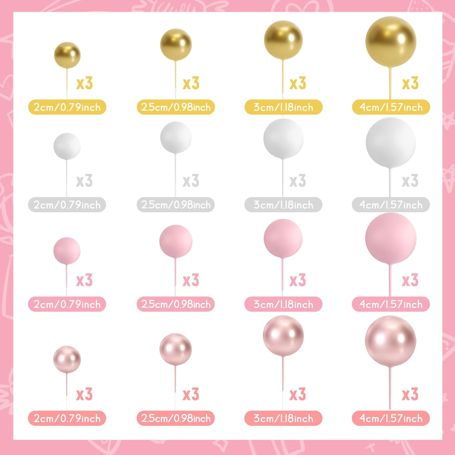 - Various Sizes: The diameter of these ball cake toppers are 0.79 inch/ 2 cm, 0.98 inch/ 2.5 cm, 1.18 inches/ 3 cm, 1.57 inches/ 4 cm, 12 pieces of each size. You can make a proper position arrangement based on the size and shape of your cake, sufficient quantity and various color of our ball shaped cake topper can meet your different needs