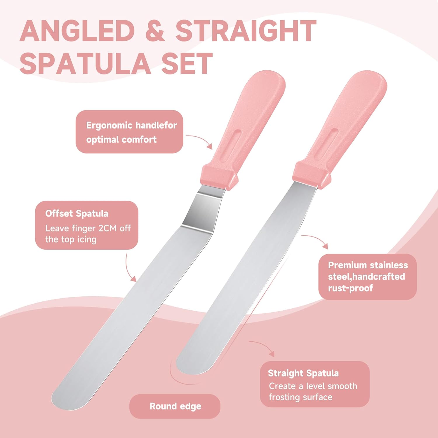 - CAKE DECORATING TOOLS :Our cake set includes scrapers, nozzles, a syringe & cake cutter, flower nails, flower lifter, straight brush, disposable bags & many more Must-Have items you'll love learning to perfect & master. Share the frosting flower fun with friends & family